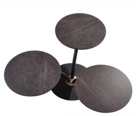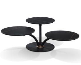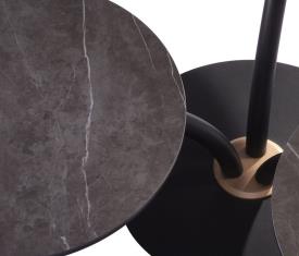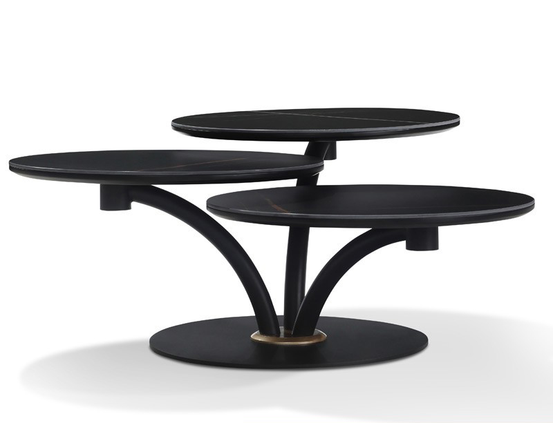 Base en métal laqué époxy noir, plateaux en céramique Jade noir-or épaisseur 3mm sur MDF.
