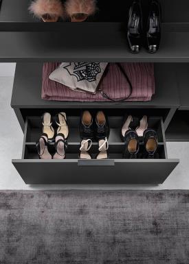 Store peut être complétée avec des panneaux arrière, des étagères, des banquettes, des bureaux, des tringles, des blocs tiroirs, des rasters, des éléments hauts ouverts, des accessoires et des barres à led.