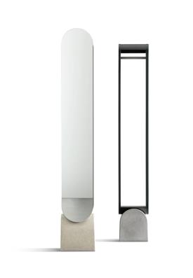 Le miroir Vague associe un miroir sur pied et un portemanteau dans un espace restreint. Reposant sur une base en béton caractéristique de la collection Vague, il présente deux panneaux émergeant verticalement : l'avant en miroir et l'arrière en bois, reliés par un cadre métallique et une barre pour suspendre des vêtements, combinant la fonction de miroir avec la praticité d'un portemanteau.
