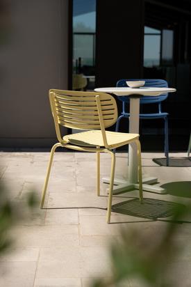La collection Mom de Coirier s’inspire des plateaux traditionnels japonais « Suiban ». La structure est entièrement réalisée en tubulaire d’acier Fe360, tandis que l’assise et le dossier, caractérisés par la ligne graphique particulière de ces plateaux, sont en tôle emboutie d’acier galvanisé. Finition Emu-Coat (Cataphorèse + laquage).