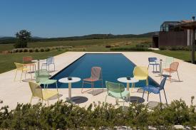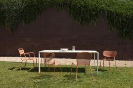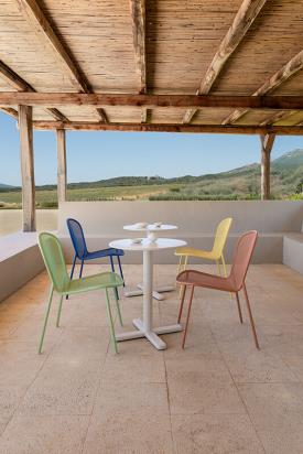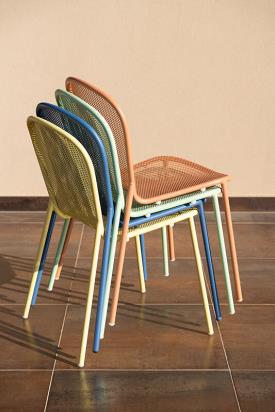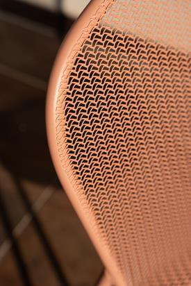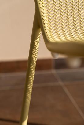 La structure est en tube de fer et la surface du dossier en métal déployé galvanisé à chaud. Semelles intérieures en nylon. Le drap est rendu doux par la forme, qui suit les courbes du corps, et par le dessin qui rappelle un tissu, une dentelle. La forme de l'accoudoir rappelle les courbes du dossier et l'inclinaison vers le dos suit l'ergonomie de l'utilisateur. Prétraitement, cataphorèse, finition en poudre thermodurcissable.