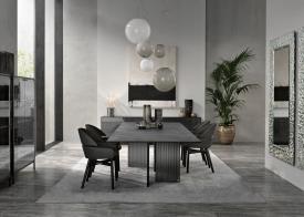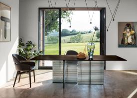 Table avec base composée par quatre ou six éléments en DV Glass de 30 mm, avec bandes colorées. Plateau en verre trempé de 15 mm transparent verni dessous avec teintes monochromes ou enduit finement à la main avec Ecomalta ou en bois plaqué noyer canaletto finition Tabac.