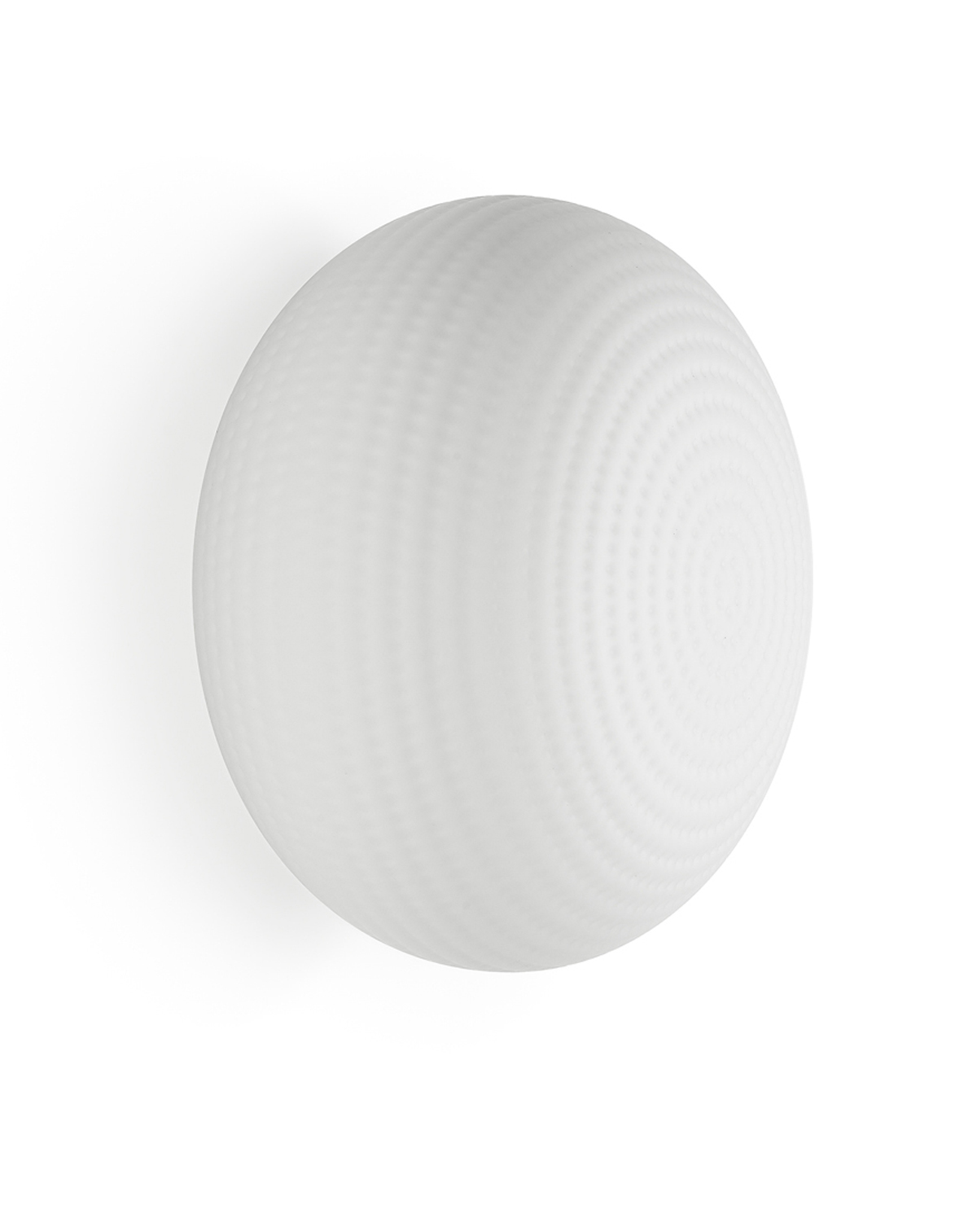 Fontana Arte Design Matti Klenell, 2015 - Réf. F432860150BINE / F432865150BINE / F432870150BINE Dimensions : Ø 16/30/50 x h 12/20/35 cm Bianca est une famille de luminaires dont le diffuseur est orné d'une série régulière de fines rainures peu profondes gravées dans le verre blanc, évoquant de petites empreintes de pas sur la neige fraîche. Soufflés à la bouche, poncés à la bande et plongés dans l'acide pour obtenir l'effet soyeux caractéristique de la verrerie fine, les diffuseurs Bianca sont disponibles en trois diamètres différents, complétant ainsi les treize modèles de luminaires de la famille. Le plus grand diffuseur, d'un diamètre de 50 cm, représente un véritable défi, de par ses dimensions et la quantité de verre nécessaire, même pour les maîtres verriers les plus expérimentés, formés à la technique du soufflage en moule fixe. Cette technique, fidèle au procédé vénitien traditionnel, consiste à travailler le verre sans aucun outil extérieur pour le modeler, en s'appuyant uniquement sur le savoir-faire et la capacité respiratoire du verrier. Bianca se décline en plusieurs versions : lampe de table sans pied, lampadaire avec pied, suspension, applique et plafonnier. Le revêtement blanc mat appliqué aux différents supports métalliques évoque le nom et la couleur du diffuseur. Bianca produit une lumière très chaude, diffuse et enveloppante. Applique murale à éclairage indirect et intensité variable. Diffuseur blanc laiteux en verre soufflé satiné. Structure en métal peint. Ampoule non fournie. lampe applique