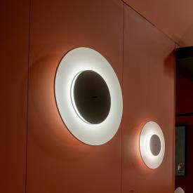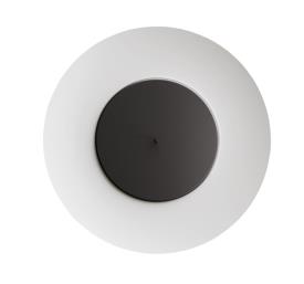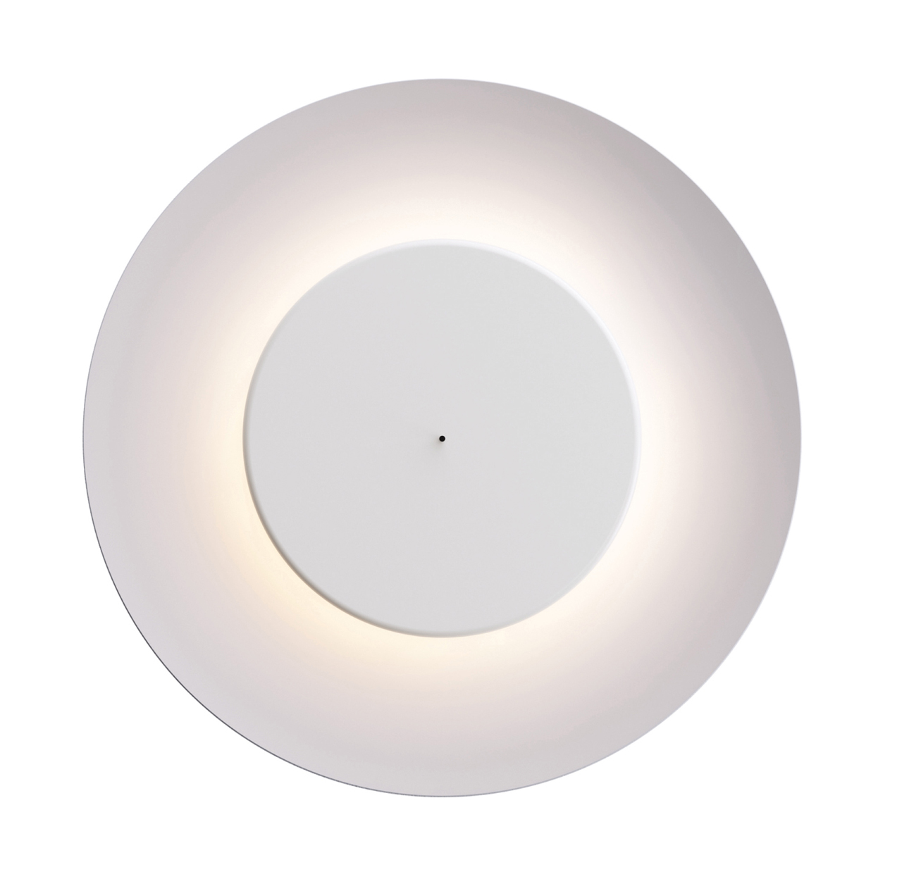 Fontana Arte Design Ferréol Babin, 2013 - Réf. F424665350BILE Dimensions : Ø 75 cm Lunaire est une applique et un plafonnier à l'effet lumineux surprenant, évoquant le phénomène des éclipses. Un petit disque frontal, contenant la source lumineuse, est placé à l'intérieur d'un large diffuseur concave en aluminium. Deux effets sont possibles selon la position du disque par rapport au diffuseur : un éclairage indirect lorsque le disque est fermé, c'est-à-dire poussé contre le mur, ou un éclairage direct depuis l'intérieur du diffuseur lorsque le disque est tiré vers l'avant. Une simple pression sur la tige située à l'avant du disque permet de modifier instantanément l'effet lumineux et de l'adapter à l'ambiance souhaitée. Grâce au grand diamètre du diffuseur, Lunaire est la solution d'éclairage idéale pour les grands espaces, qu'ils soient résidentiels ou professionnels. Applique murale. Corps arrière en polyéthylène. Réflecteur et capuchon en métal peint. LED incluse. lampe applique