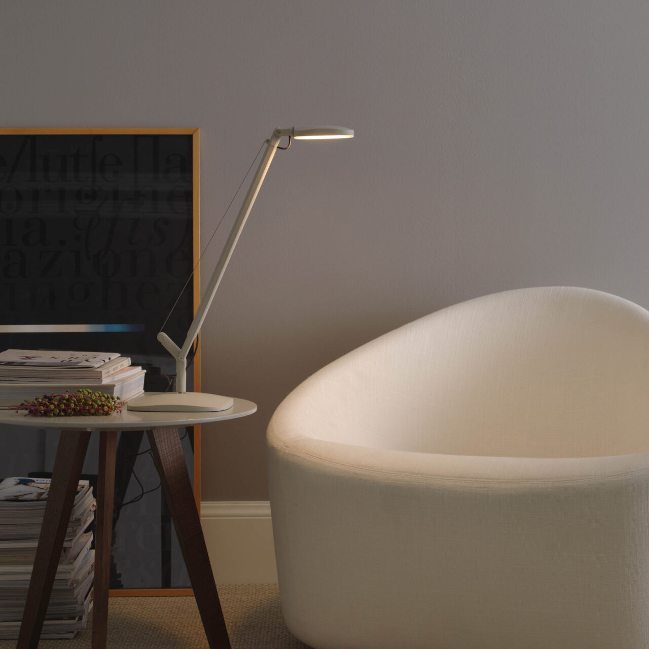 Fontana Arte Design Odo Fioravanti, 2025 Volée est un luminaire LED de dernière génération, alliant recherche esthétique et innovation technologique. Caractérisée par un design épuré, Volée s'allume d'un geste presque instinctif : un simple mouvement de la main sous la tête du luminaire active un dispositif électronique qui allume ou éteint la lumière sans contact. Un capteur tactile situé au-dessus de la tête permet de régler l'intensité lumineuse sur quatre niveaux (40 %, 60 %, 100 %, 0 %). Une fonction de temporisation éteint automatiquement la lampe après 5 heures d'utilisation. La tension des mécanismes d'équilibrage à ressorts invisibles est assurée par des câbles en acier qui permettent d'orienter le faisceau lumineux avec fluidité. Volée s'intègre à tous les types d'environnements, modernes comme traditionnels. Matériau : Métal, Polymère lampe de table