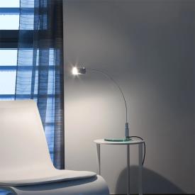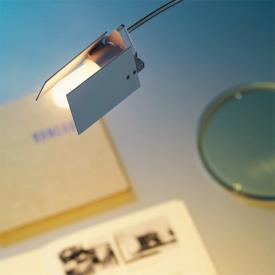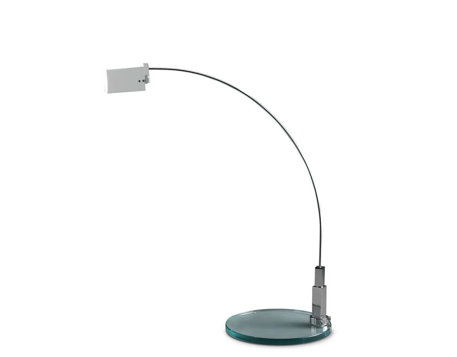 Lampe de table à lumière directionnelle et double intensité lumineuse non dimmable. Structure en métal chromé avec corps orientable à 360°. Base en verre flotté taillé. Ailettes de diffuseur pivotantes en aluminium anodisé. Écran de protection de l'ampoule en verre sablé. Connexion électrique entre la base et le corps par jack. Câble d'alimentation, interrupteur et prise noirs. Alimentation par prise européenne bipolaire. Ampoule non incluse.