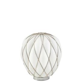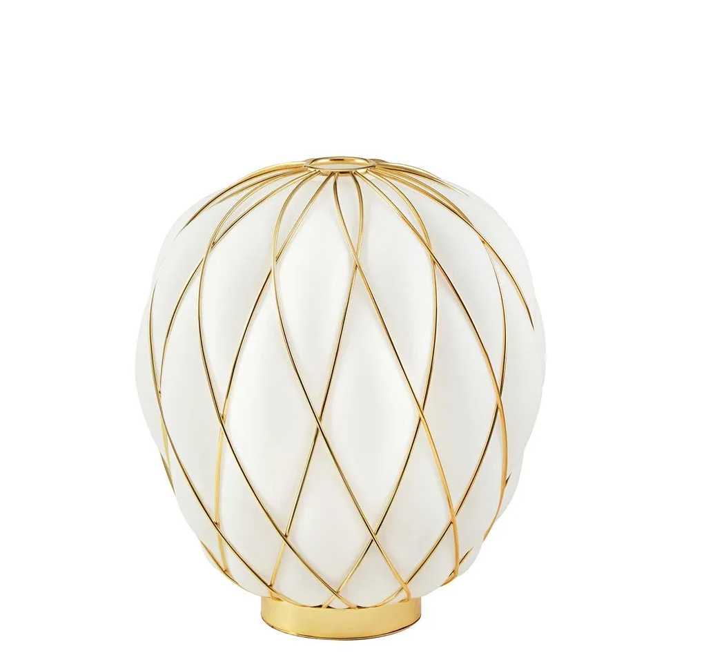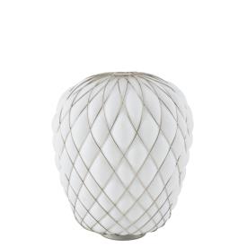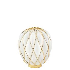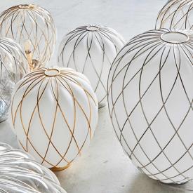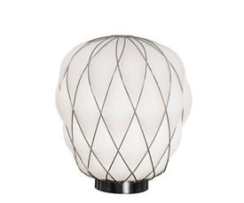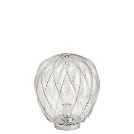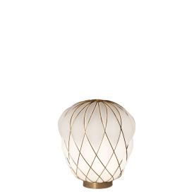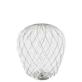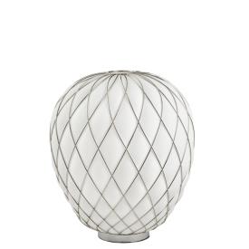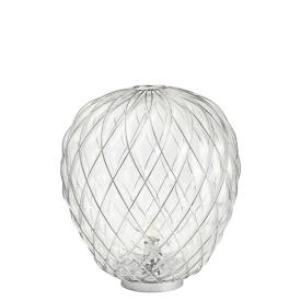 Fontana Arte Design Paola Navone, 2016 - Réf. F436405575OBNE Dimensions : Ø 30 x h 36 cm Pinecone une lampe de table. Le diffuseur est réalisé selon la technique ancienne du verre soufflé en cage : le verrier souffle la goutte de verre fondu dans une cage métallique qui ne contient qu'une partie de son expansion naturelle. De cette façon, la surface du verre est en partie emprisonnée par la cage et en partie s'échappe, générant une impression de tension tandis que l'objet lutte pour se libérer de son harnais ; la cage est encore enrichie par le traitement galvanique qui lui donne un aspect brillant et brillant. La version transparente, en particulier, révèle une double structure qui multiplie l'effet scénographique, tandis que le motif de la cage métallique projette des effets d'ombre kaléidoscopiques sur les surfaces environnantes. Au contraire, dans la version blanche, le verre enveloppe délicatement la surface de la cage et en exalte le motif géométrique, générant une lumière diffuse élégante et agréable à l'œil. Le luminaire est très attrayant et impressionnant, qu'il soit allumé ou éteint. Lampe de table à lumière diffuse et réglable. Diffuseur fermé en verre soufflé dépoli. Cage et base en métal galvanisé. Câble d'alimentation, variateur et prise transparents. Prise européenne bipolaire. Ampoule non incluse. lampe de table
