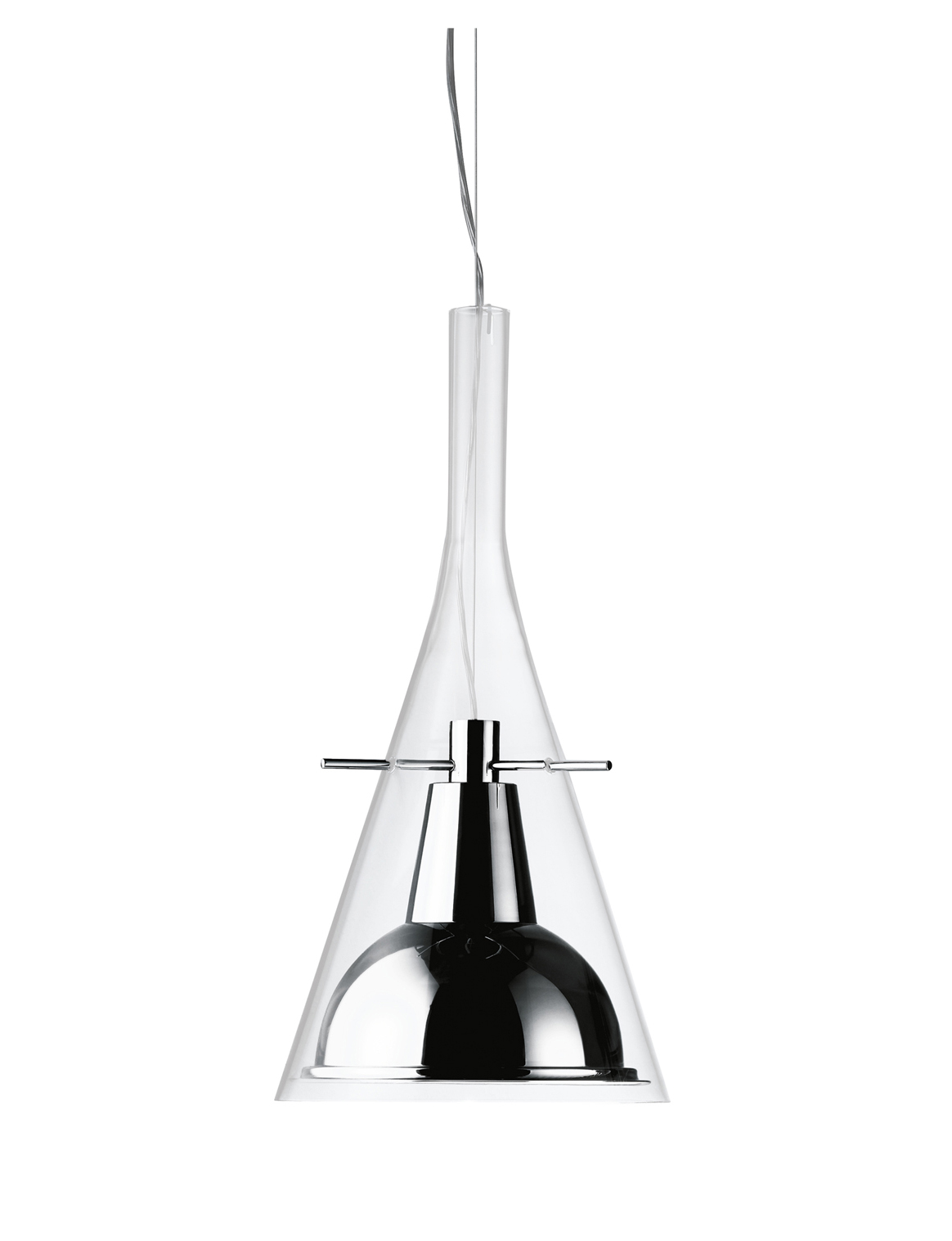 Fontana Arte Design. Franco Raggi, 1999 - Réf. F333795150TCNE Dimensions : Ø 18/31 x h 200 cm Un cône de verre maintient le réflecteur en aluminium chromé, soutenu par trois fines tiges métalliques. Equilibre et légèreté pour cette famille de lampes disponibles en version sol et applique, pour une émission de lumière indirecte, et en version suspendue, pour une lumière focalisée directe. Lampe à suspension à lumière directe et variable. Diffuseur en verre borosilicaté transparent. Réflecteur en aluminium chromé brillant. Support de réflecteur en métal chromé. Câble d'alimentation transparent. Rosace de plafond en matière thermoplastique chromée. Ampoule non incluse. lampe suspension