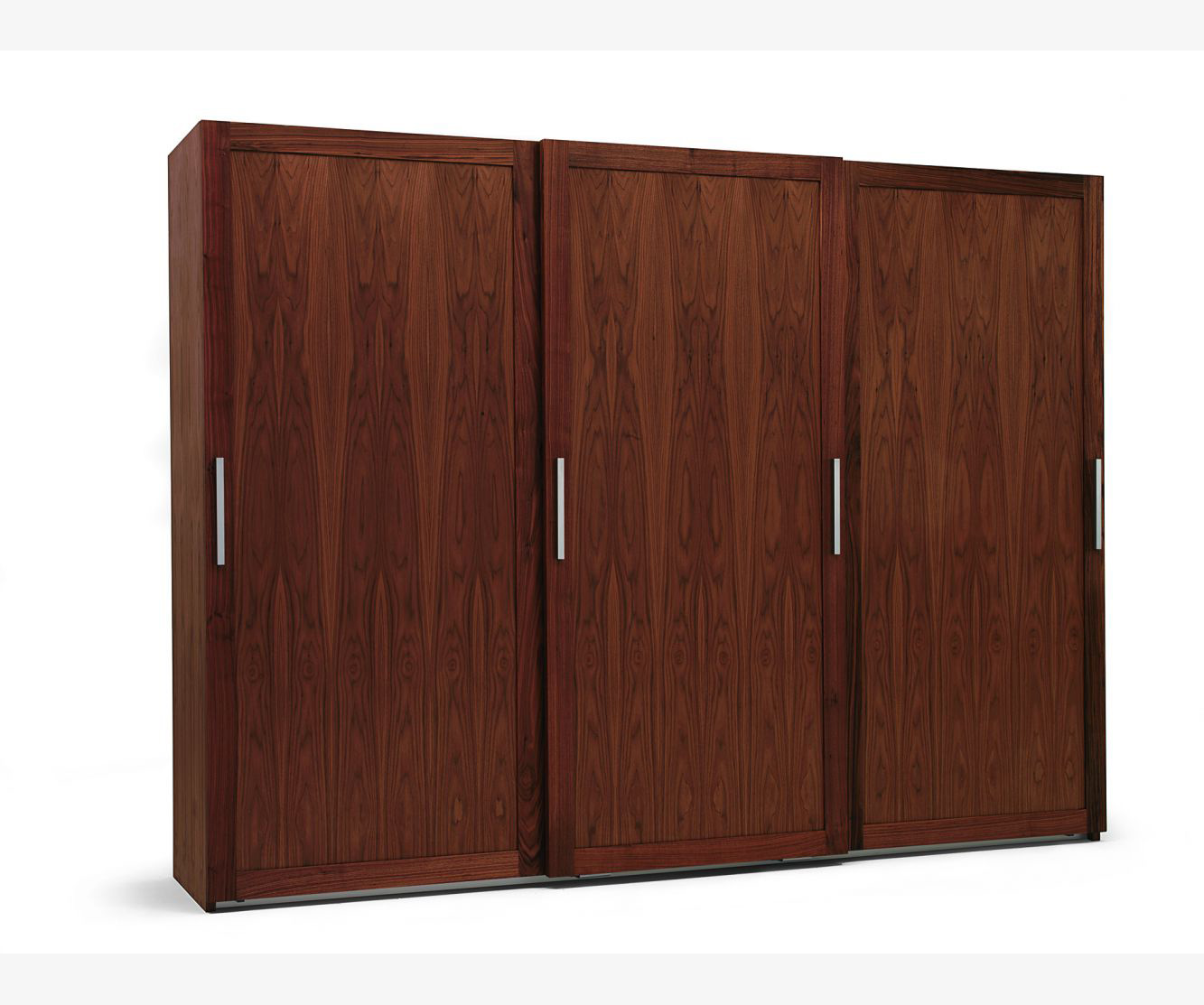 Une armoire en parpaings et bois massif avec des portes coulissantes sur double rail en aluminium, avec des façades lisses entourées d'un cadre en relief avec des poignées en métal. Elle offre une organisation fonctionnelle et modulaire des différents éléments en fonction des besoins de rangement et des dimensions requises. Personnalisable grâce à l'insertion de cintres, d'étagères, de blocs-tiroirs en bois massif avec joints traditionnels à queue d'aronde et de divers accessoires. Idéal avec l'intérieur en bois de cèdre parfumé, un remède naturel contre les mites. Éclairage LED disponible sur demande.