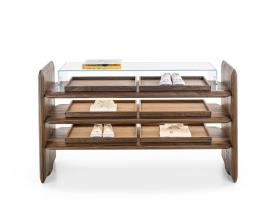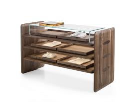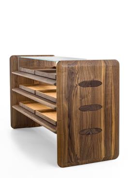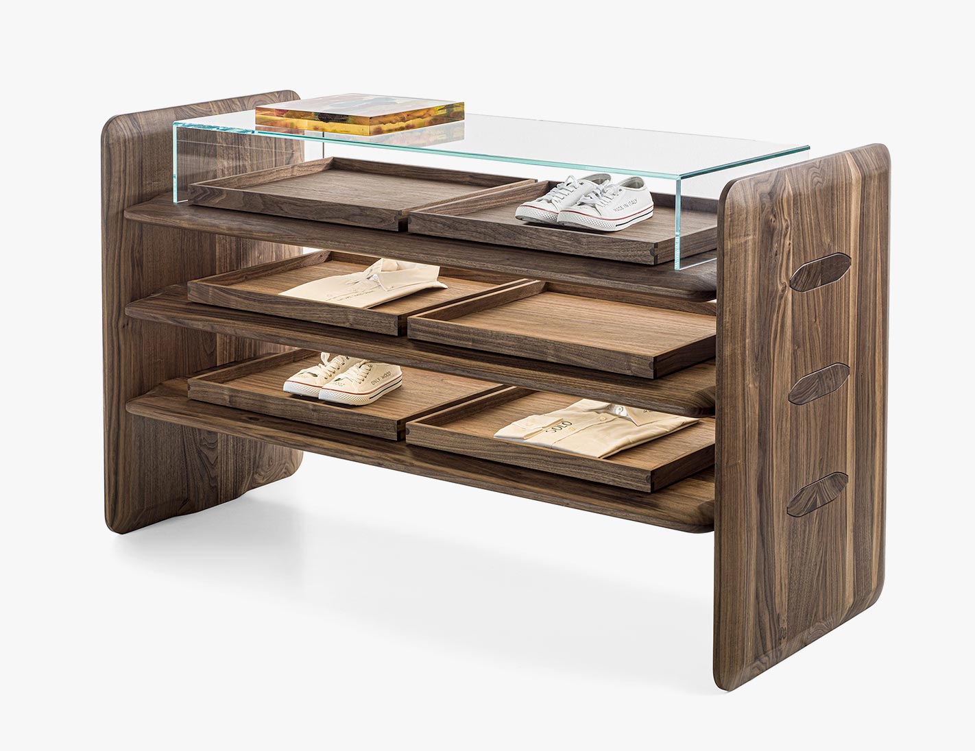Élément de rangement central idéal pour les dressings, en bois massif. Composé de trois étagères qui se croisent aux côtés par des joints visibles. Doté de six compartiments assemblés en queue d'aronde, deux sur chaque étagère, avec coulisses en bois. Éclairé par des bandes LED positionnées sous la première et la deuxième étagère. Disponible, sur demande, une boîte en verre à appliquer sur la première étagère ayant fonction de vitrine.