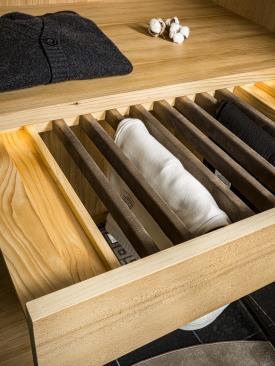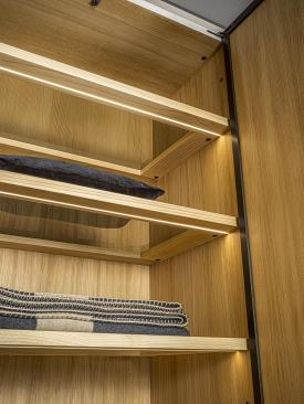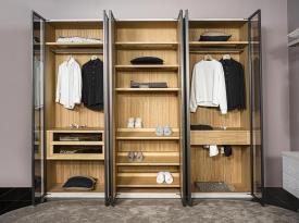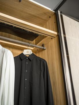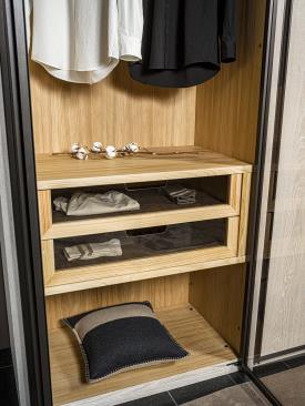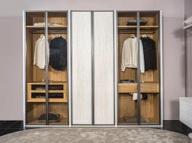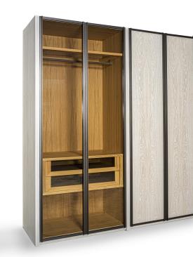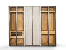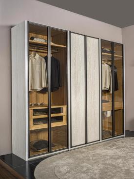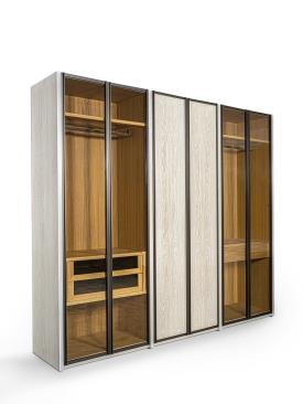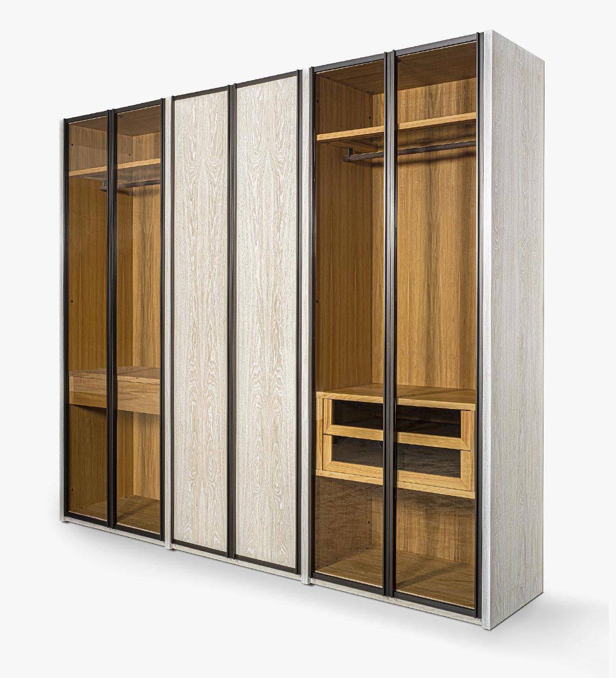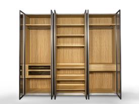 armoire en bois latté plaqué et bois massif, avec portes battantes en verre ou en bois avec cadre en aluminium laqué. Le cadre de la porte, en plus de remplir une fonction structurelle, est conçu pour servir également de poignée, grâce au positionnement vers l'arrière du verre. L'armoire offre une organisation fonctionnelle et modulaire des différents éléments en fonction des besoins de rangement et des dimensions requises. Personnalisable avec l'ajout de barres-penderie, d'étagères, de tiroirs en bois massif avec assemblages traditionnels en queue d'aronde et de divers accessoires. Idéal avec des intérieurs en bois de cèdre odoriférant, un remède naturel contre les mites. Éclairage LED disponible sur demande.