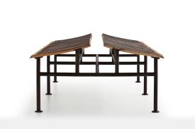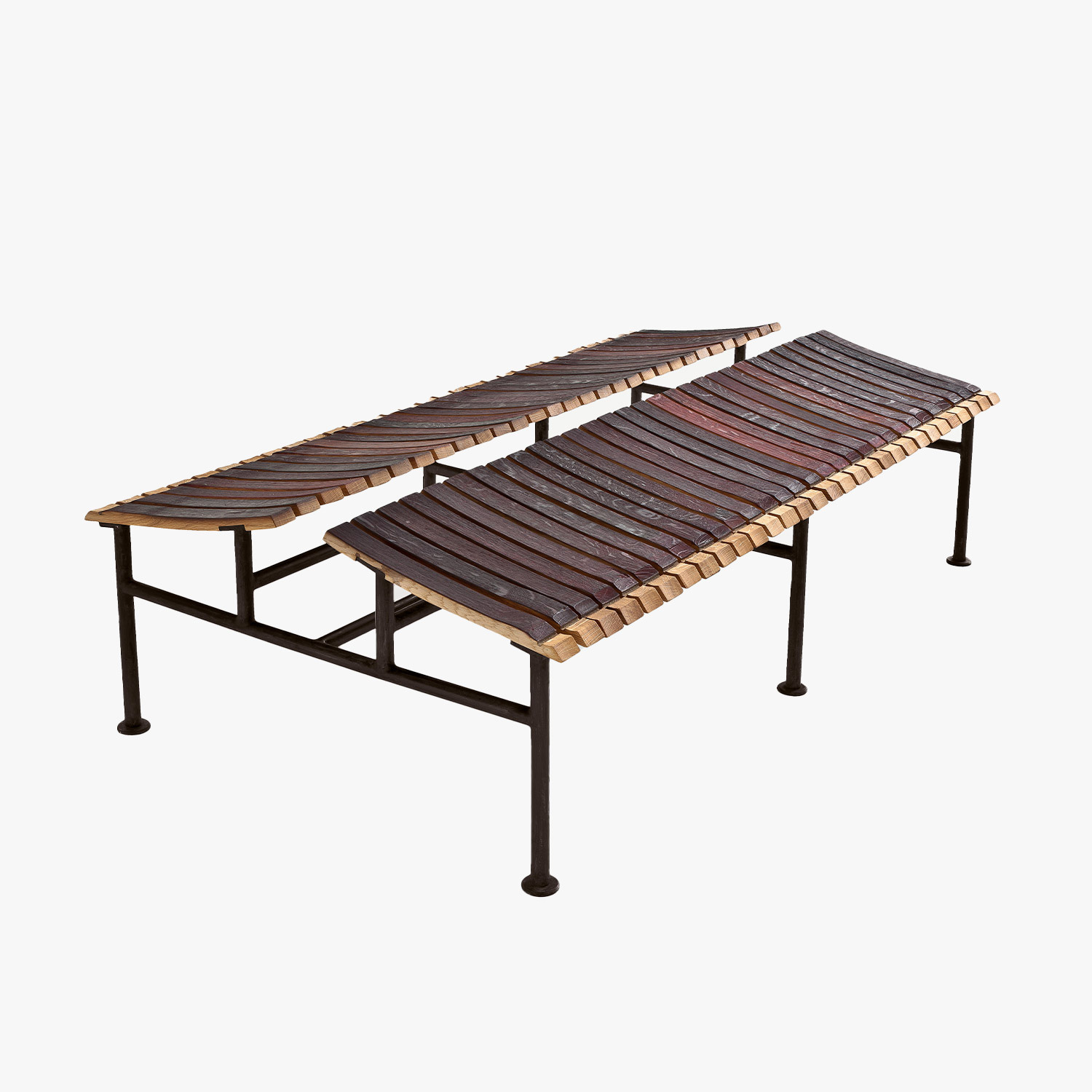 Design. Aldo Cibic, 2022 Banc à double assise inclinée, réalisé en douves de bois de Barrique, combinées à une structure en fer.