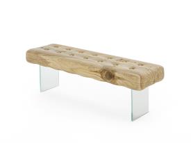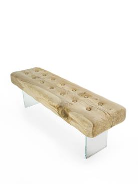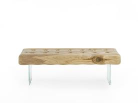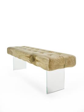 Banc en bois de cèdre massif odoriférant, fabriqué à partir d’un seul bloc, caractérisé par une assise qui rappelle la forme d'un matelas, créant un contraste avec l'idée de douceur, tout en offrant un confort considérable. Le banc est décoré de boutons en bois de cèdre et repose sur des pieds en verre ou acier.