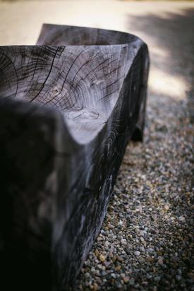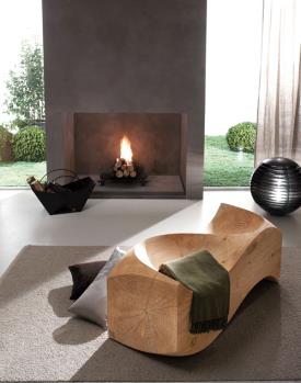 Banquette en bois massif de cèdre parfumé sculptée à partir d'un seul bloc, caractérisée par un design original et ergonomique permettant un contact vis-à-vis.