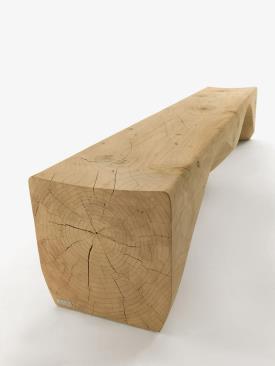 Riva 1920 Design. Hsiao-Ching Wang, 2016 Dimensions : l 240 x h 45 x p 42 cm Banc fabriqué à partir d'un seul bloc de cèdre massif odoriférant, caractérisé par un mouvement onduleux et sinueux qui forme un dessin alternant plein/vide. banc outdoor