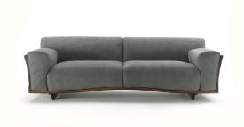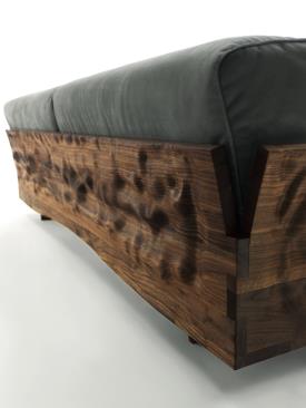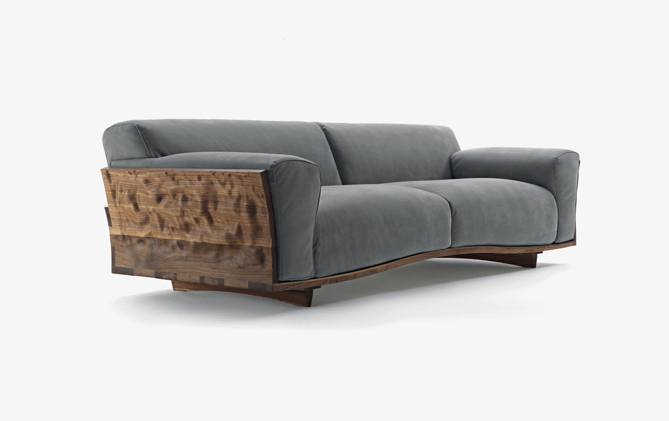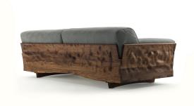 Riva 1920 Design. Fabrizio Zappa, 2017 Dimensions : l 116/239/320 x h 42/72 x p 106 cm Canapé avec structure sculptée dans le bois massif, avec dos et accoudoirs unis par une extraordinaire queue d’aronde qui fait tendre le bois vers l’extérieur. La base courbée accueille grands coussins en cuir ou en tissu avec coutures apparentes. Clairem.
