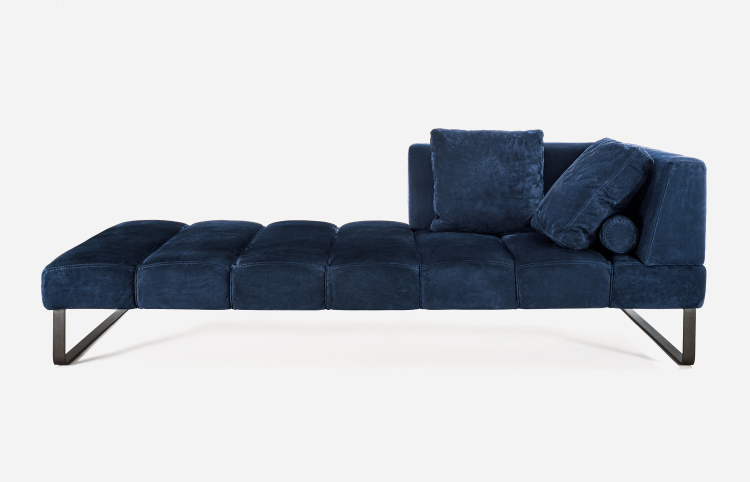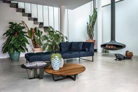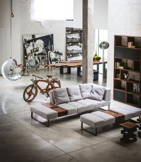 Canapé rembourré avec revêtement et coussins en cuir ou en tissu et coutures apparentes. Doté de pieds en acier, il est disponible en différentes compositions et modules, certains caractérisés par la présence de modules en bois massif, travaillés à parti.