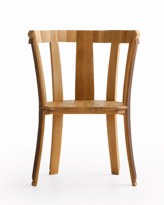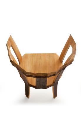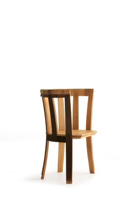 Riva 1920 Design. Chiara Ferragamo et Davide Rocchi, 2022 Dimensions : l 68 x h 93,6 x p 55,7 cm chaise composée par des douves en chêne, provenant de barriques, disposées en demi-cercle, mettant en valeur la forme curviligne de l'assise.