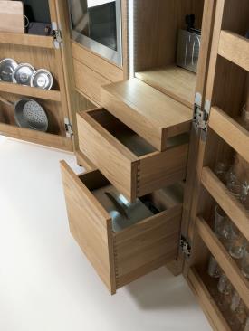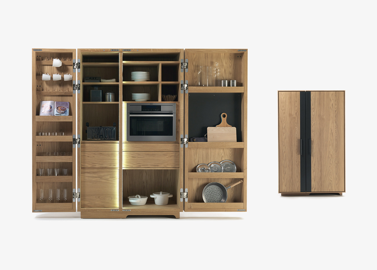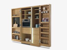 Riva 1920 Design. Giuliano Cappelletti, 2014 Dimensions : l 127/255 x h 201 x p 60/79 cm Meuble de rangement multifonctionnel en panneaux de particules et bois massif avec double porte à angle d'ouverture de 180°. L'équipement comprend des compartiments de rangement de différentes tailles, avec la possibilité d'insérer de petits appareils électroménagers (dans la version Jumbo). Les portes sont des compartiments de rangement, à l'intérieur desquels il est possible de placer des verres, de la vaisselle et des accessoires. L'intérieur de l'armoire est éclairé par des bandes LED positionnées sur l'épaulement central, qui s'allument automatiquement grâce à des capteurs activés à l'ouverture des portes. EQUIPEMENT STANDARD : VOIR DESSINS TECHNIQUES PETITE PORTE A GAUCHE ET GRANDE PORTE A DROITE MAIS INTERCHANGEABLE SUR DEMANDE POUR LA VERSION JUMBO (avec la possibilité d'insérer de petits appareils encastrables tels que réfrigérateur, four à micro-ondes, cave à vin) : le compartiment est conçu pour des appareils ayant des dimensions maximales d'encastrement L.56 P.55 H.45 cm, sur mesure sur demande. Il est nécessaire d'envoyer la fiche technique de l'appareil choisi pour vérification technique.