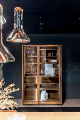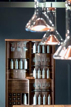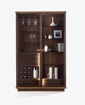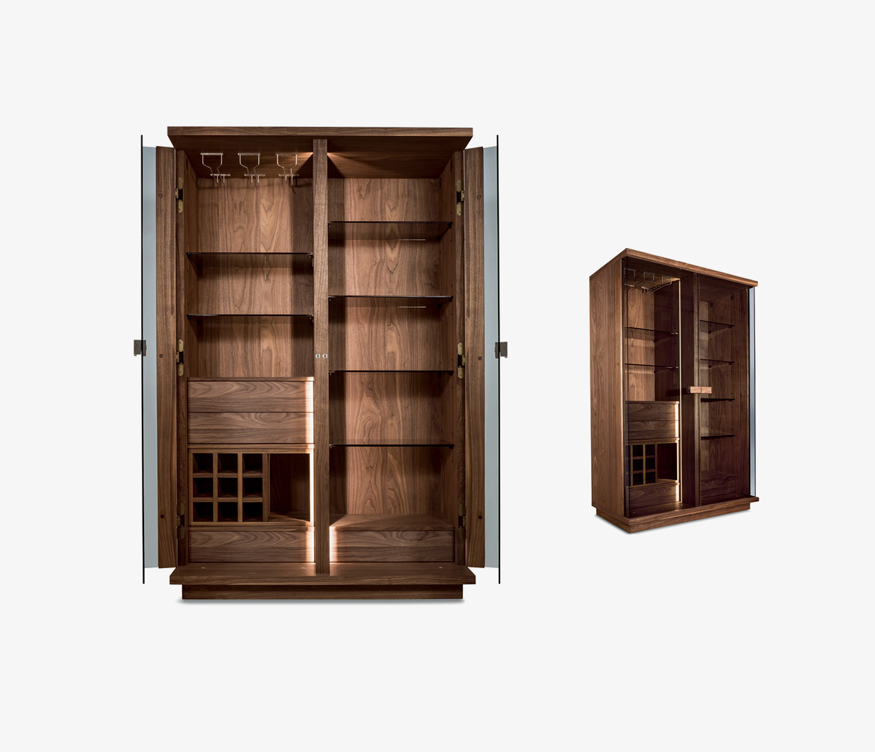 Meuble de rangement multifonctionnel en bois massif avec double porte en verre fumé avec angle d'ouverture de 180° et poignée en bois appliquée. L'aménagement intérieur et les accessoires sont conçus en fonction des exigences de rangement et de fonctionnalité, avec la possibilité d'insérer de petits appareils électriques (dans la version Jumbo). L'intérieur de l'armoire est éclairé par des bandes LED positionnées sur l'épaulement central, qui s'allument automatiquement grâce à des capteurs activés par le passage de la main.