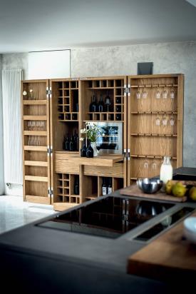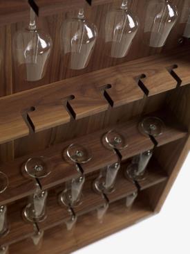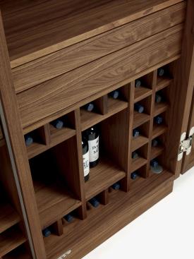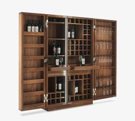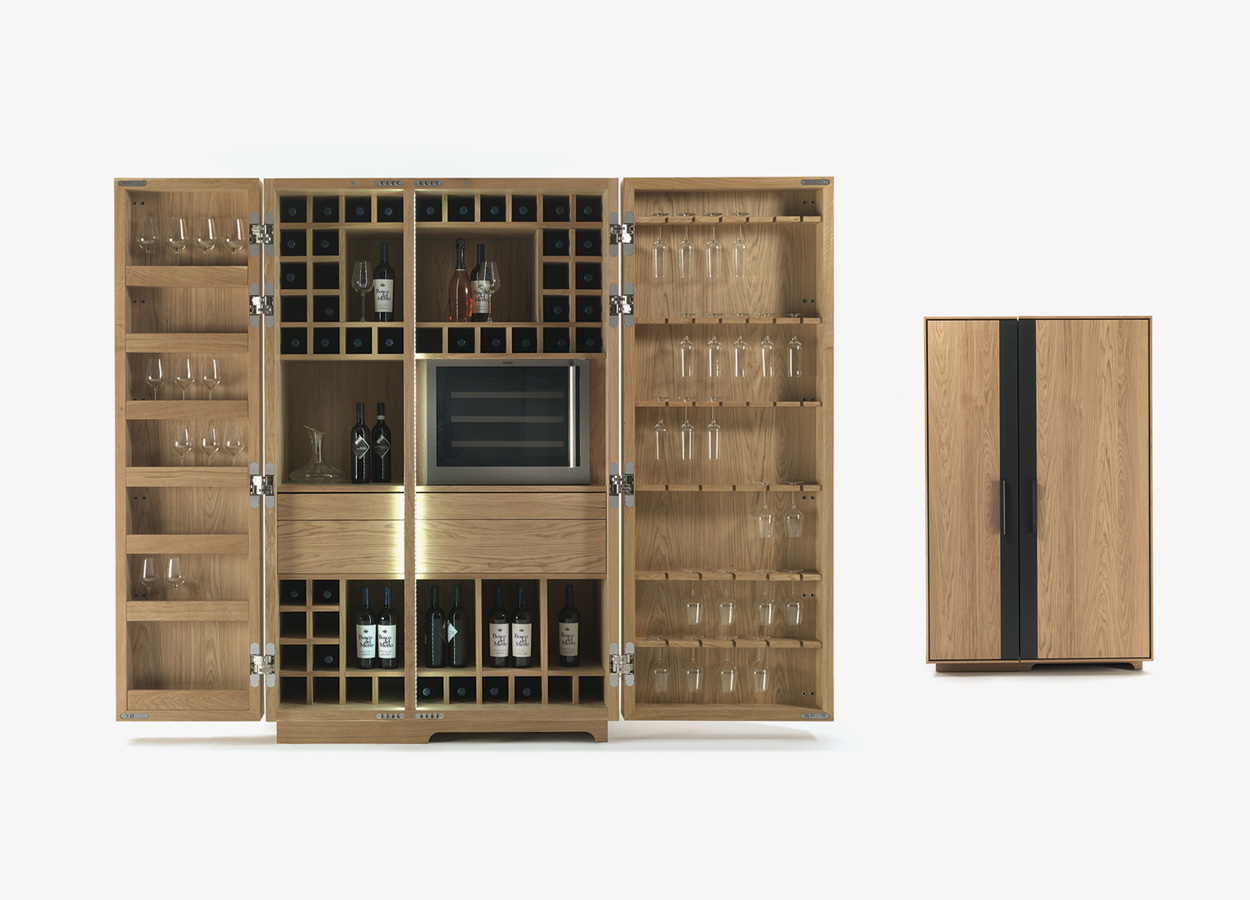 Riva 1920 Design. Giuliano Cappelletti, 2014 Dimensions : l 127/255 x h 201 x p 60/79 cm Meuble de rangement multifonctionnel en aggloméré et bois massif avec double porte à angle d'ouverture de 180°. L'aménagement intérieur comprend des compartiments de rangement pour les bouteilles et les verres, avec la possibilité d'insérer de petits appareils électriques (dans la version Jumbo). Les portes sont des compartiments de rangement et il est possible d'y placer des verres et des accessoires. L'intérieur de l'armoire est éclairé par des bandes LED placées sur l'épaulement central, qui s'allument automatiquement grâce à des capteurs activés à l'ouverture des portes. POUR LA VERSION JUMBO (avec la possibilité d'insérer de petits appareils encastrables tels que réfrigérateur, four à micro-ondes, cave à vin) : le compartiment est conçu pour des appareils dont les dimensions maximales d'encastrement sont L.56 P.55 H.45 cm, qui peuvent être réalisées sur mesure sur demande. Veuillez envoyer la fiche technique de l'appareil choisi pour vérification technique.