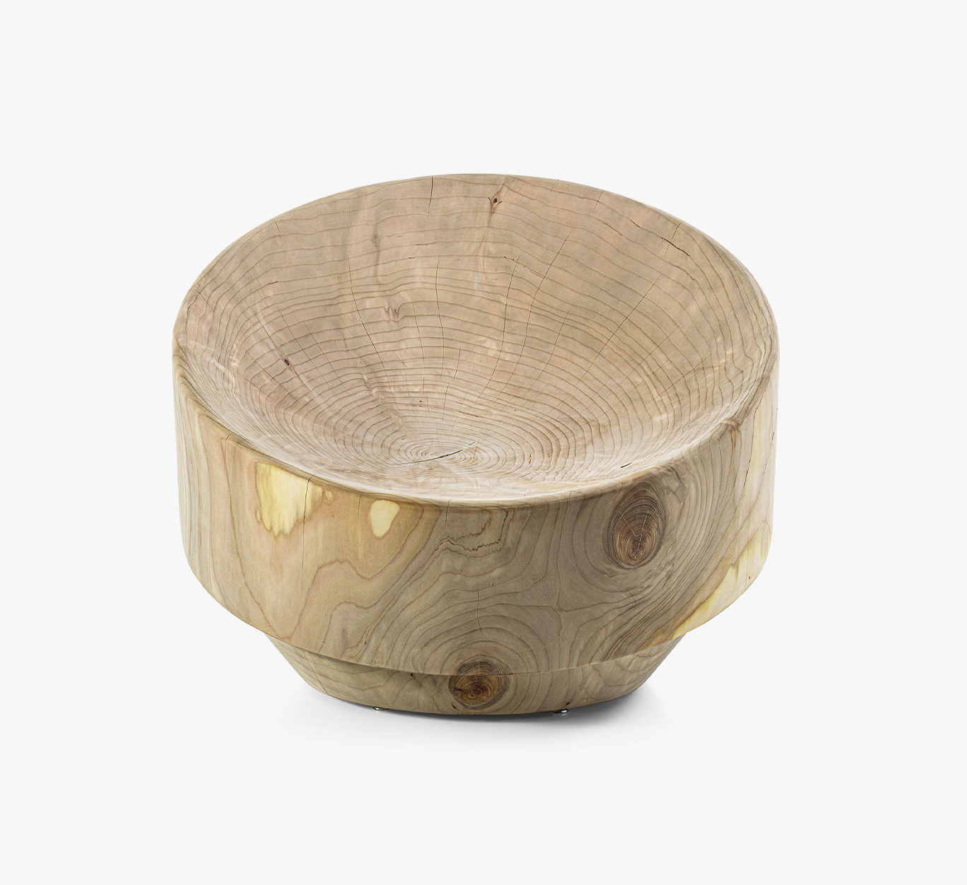 Fauteuil en bois de cèdre massif odoriférant, fabriqué à partir d’un seul bloc. Un monolithe sculptural au design curviligne doté d'une assise ergonomique alignée avec le dossier. Son design naît d’une recherche minutieuse sur l’impact de formes circulaires parfaites, presque cinétiques, sur les volumes des matières premières.