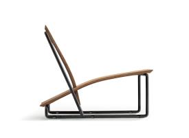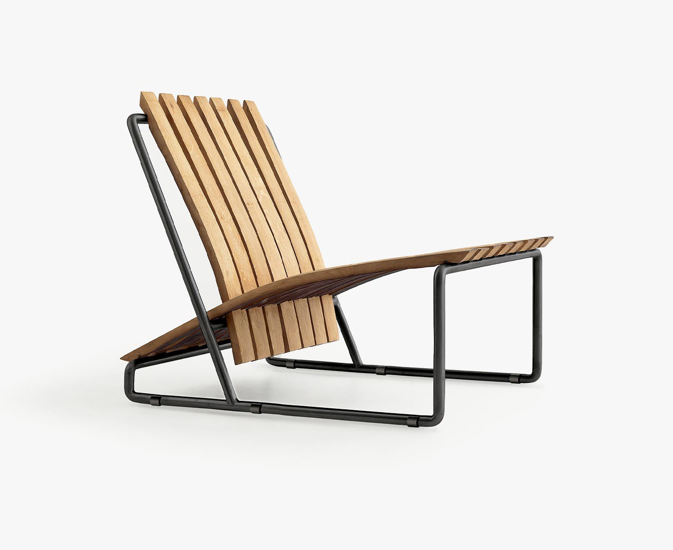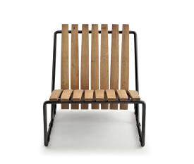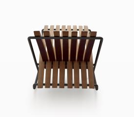Fauteuil en lattes de barriques, structure en acier. Il se caractérise par le jeu spécial obtenu par l'intersection des douves de l'assise et du dossier.