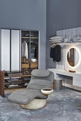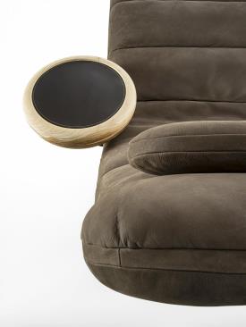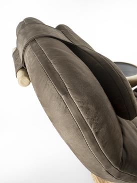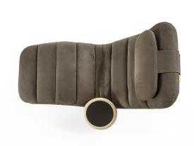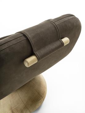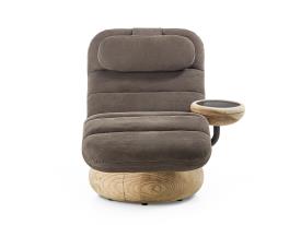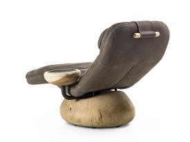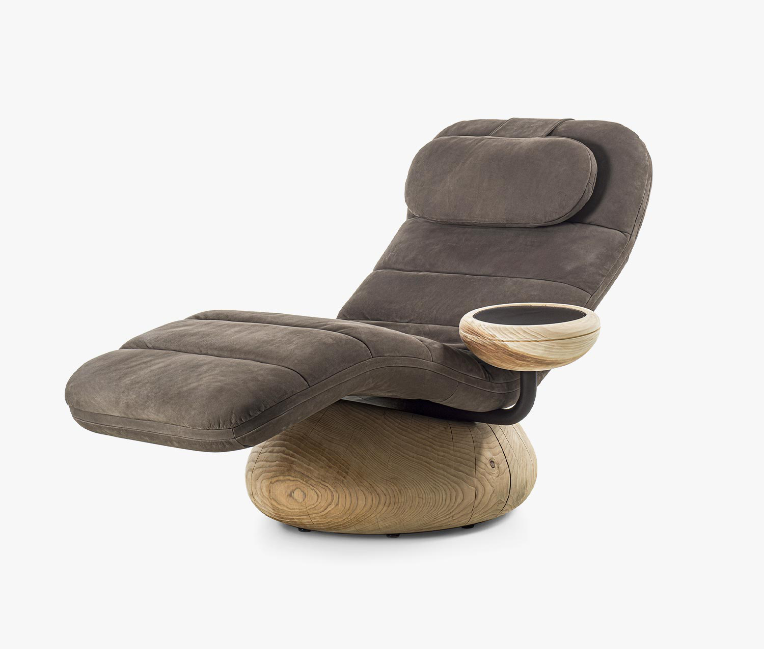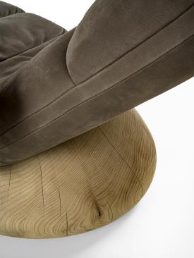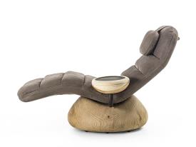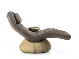 Chaise longue rembourrée avec assise ergonomique qui s'ajuste parfaitement à la forme du corps. Le revêtement est disponible en tissu ou en cuir. L'assise, constituée d'une coque en bois, est incliné pour favoriser la détente. La stabilité est assurée par un piédestal en cèdre odoriférant, fabriqué à partir d’un seul bloc, au profil doux et arrondi. Elle est équipée d'un appui-tête rembourré, maintenu en position par un contrepoids en bois de cèdre. Sur demande, une table d’appoint intégrée en cèdre massif, reprenant la forme de la base, est disponible.