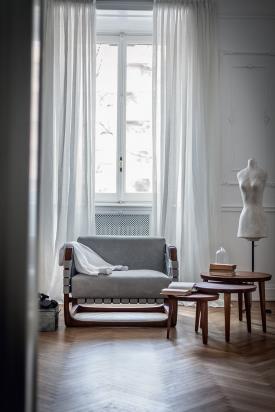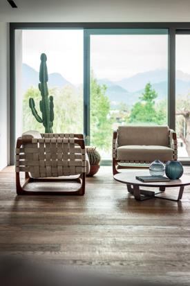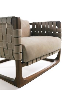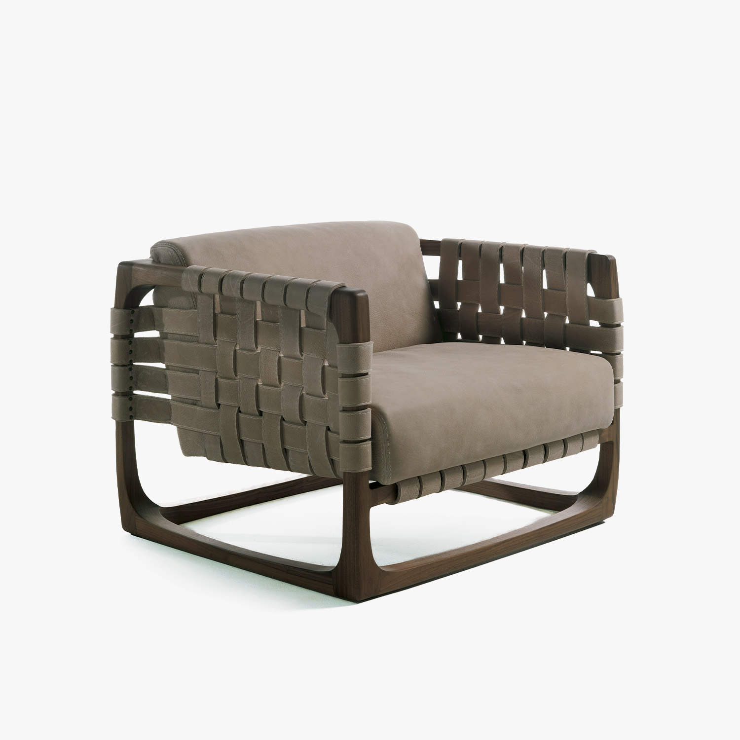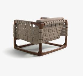 Riva 1920 Design. Jamie Durie, 2014 Dimensions : l 95 x h 40/77 x p 83 cm Fauteuil rembourré avec une structure en bois massif entièrement tournée, assemblée et poncée à la main. Un tissage de cordes en cuir ou en tissu caractérise l'assise, le dossier et les accoudoirs. Dans la version en tissu, un renfort structurel est prévu à l'intérieur du revêtement. Ce produit est adapté à une utilisation en extérieur. Toutefois, il est recommandé de l’installer dans des zones partiellement abritées, telles qu’un auvent ou une véranda, afin de préserver ses qualités esthétiques et fonctionnelles dans le temps. La version extérieure est disponible exclusivement en bois d’iroko et en tissu Patio. fauteuil outdoor