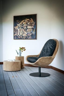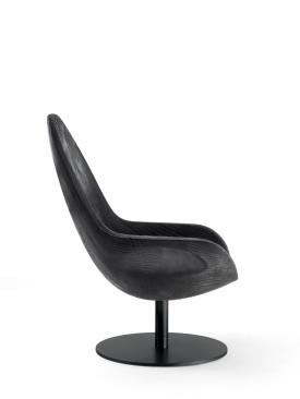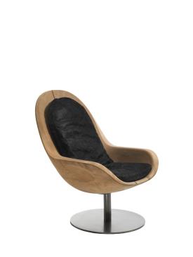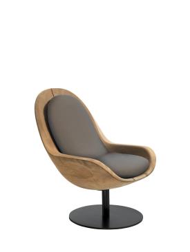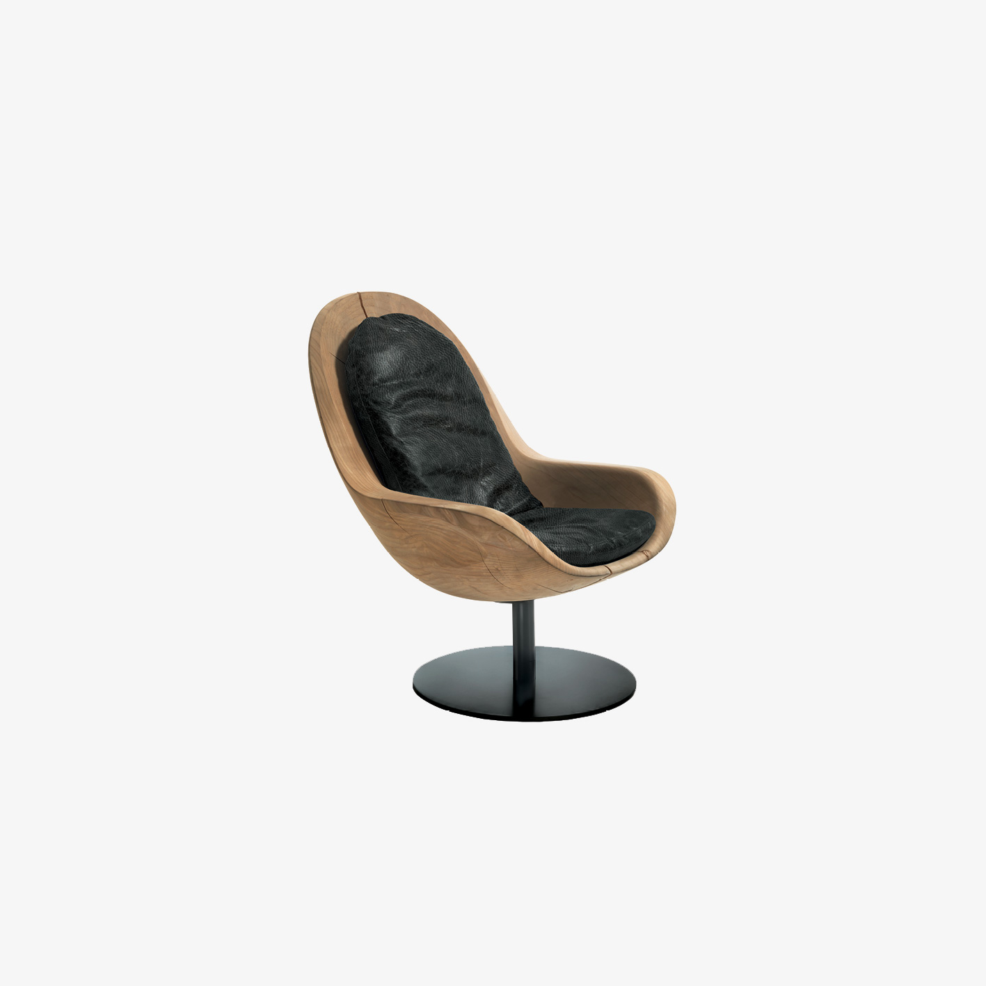 Riva 1920 Design. Pininfarina, 2010 Dimensions : l 77 x h 107,9 x p 89 cm Fauteuil fabriqué à partir d'un seul bloc de cèdre parfumé. Se distingue par son corps enveloppant et ergonomique en ligne continue de l'assise au dossier. Sur demande coussin en tissu ou cuir avec coutures apparentes. Base avec pied tubulaire et plaque en fer. fauteuil outdoor