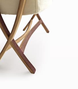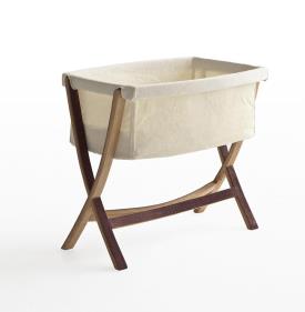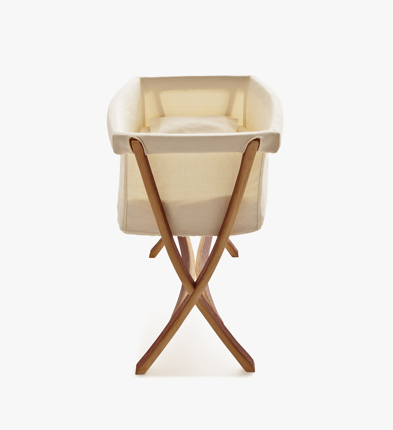Berceau avec structure en "X" créée par les bois courbes des barriques, qui se rejoignent pour soutenir le "sac" en tissu qui donne du confort au berceau. Disponible avec ou sans base à bascule
