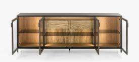Riva 1920 Design. Giuliano and Gabriele Cappelletti,2019 Dimensions : l 125*185/246 x h 92 x p 50,5 cm Meuble de rangement multifonctionnel en bois aggloméré avec portes en verre et cadre en aluminium. L'équipement intérieur est conçu en fonction des exigences de rangement et de fonctionnalité, et se compose d'étagères en verre seules ou avec l'ajout de deux tiroirs intérieurs en bois massif avec poignées encastrées, assemblés à queue d'aronde. L'intérieur de l'armoire est éclairé par des bandes LED positionnées sur les épaulements centraux, qui s'allument automatiquement grâce à des capteurs activés à l'ouverture des portes. ÉQUIPEMENT STANDARD : VOIR DESSINS TECHNIQUES