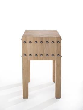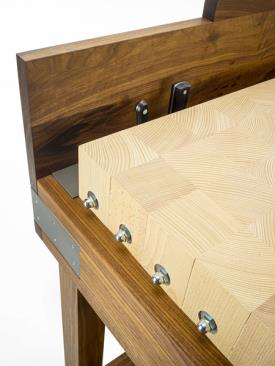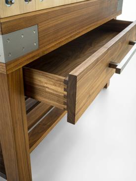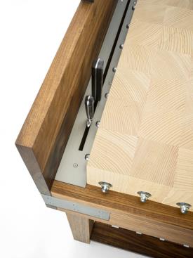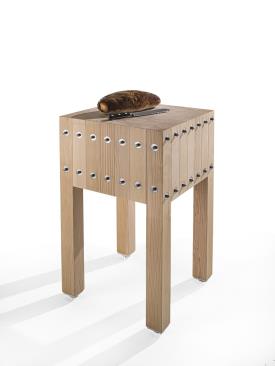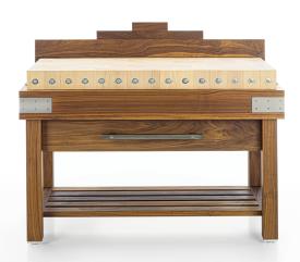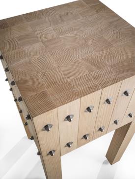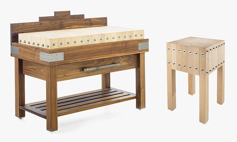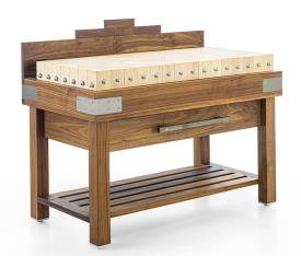 Deux billots consoles en bois massif avec plateau en hêtre, l'un traditionnel, c'est-à-dire plus haute que le plan de travail de la cuisine et avec le plateau en bois de bout pour découper les viandes, et l'autre « billot îlot» équipé d’un tiroir et un porte-couteaux, servant d'îlot de travail.
