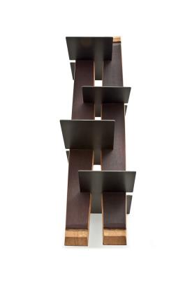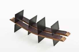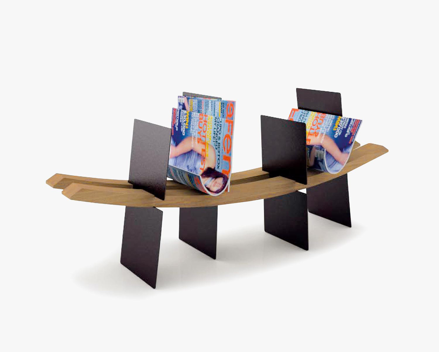 Design. Claudio Bellini, 2022 Dimensions : l 93 x h 16 x p 51 cm Porte-magazines caractérisé par la combinaison de douves des barriques et de la structure de support en acier.