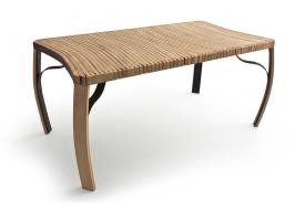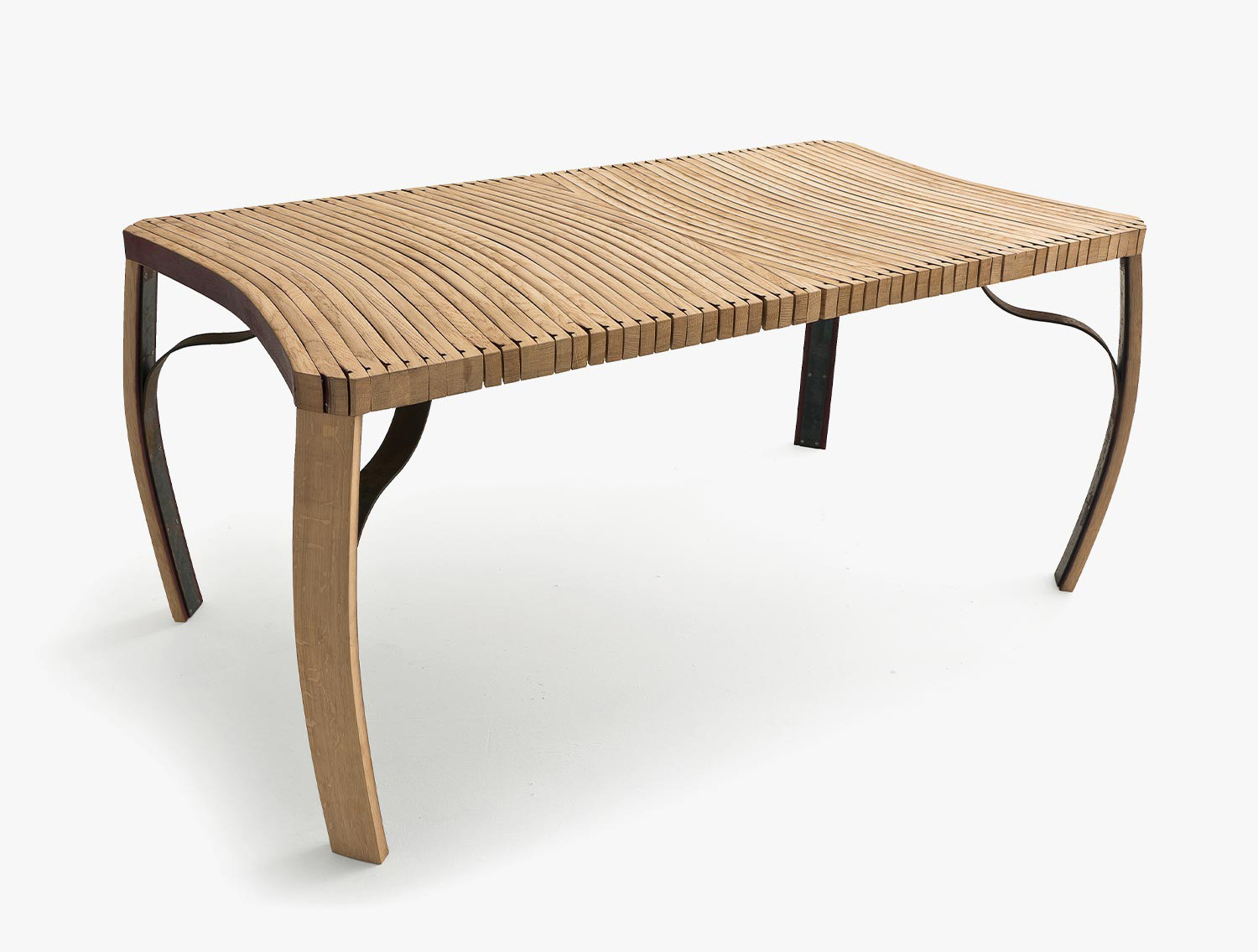 table avec plateau composé par des lattes en bois massif de chêne des barriques. Les douves caractérisent également la forme arquée des pieds