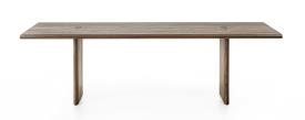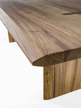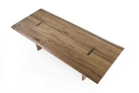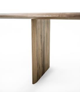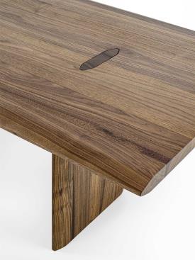 table fabriquée en bois massif à lattes collées, avec des pieds visibles sur le plateau grâce à un joint caractéristique. La géométrie du joint est reprise dans la section du plateau et des pieds, dans une version plus allongée pour assurer la cohérence esthétique et structurelle.