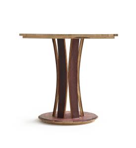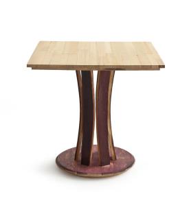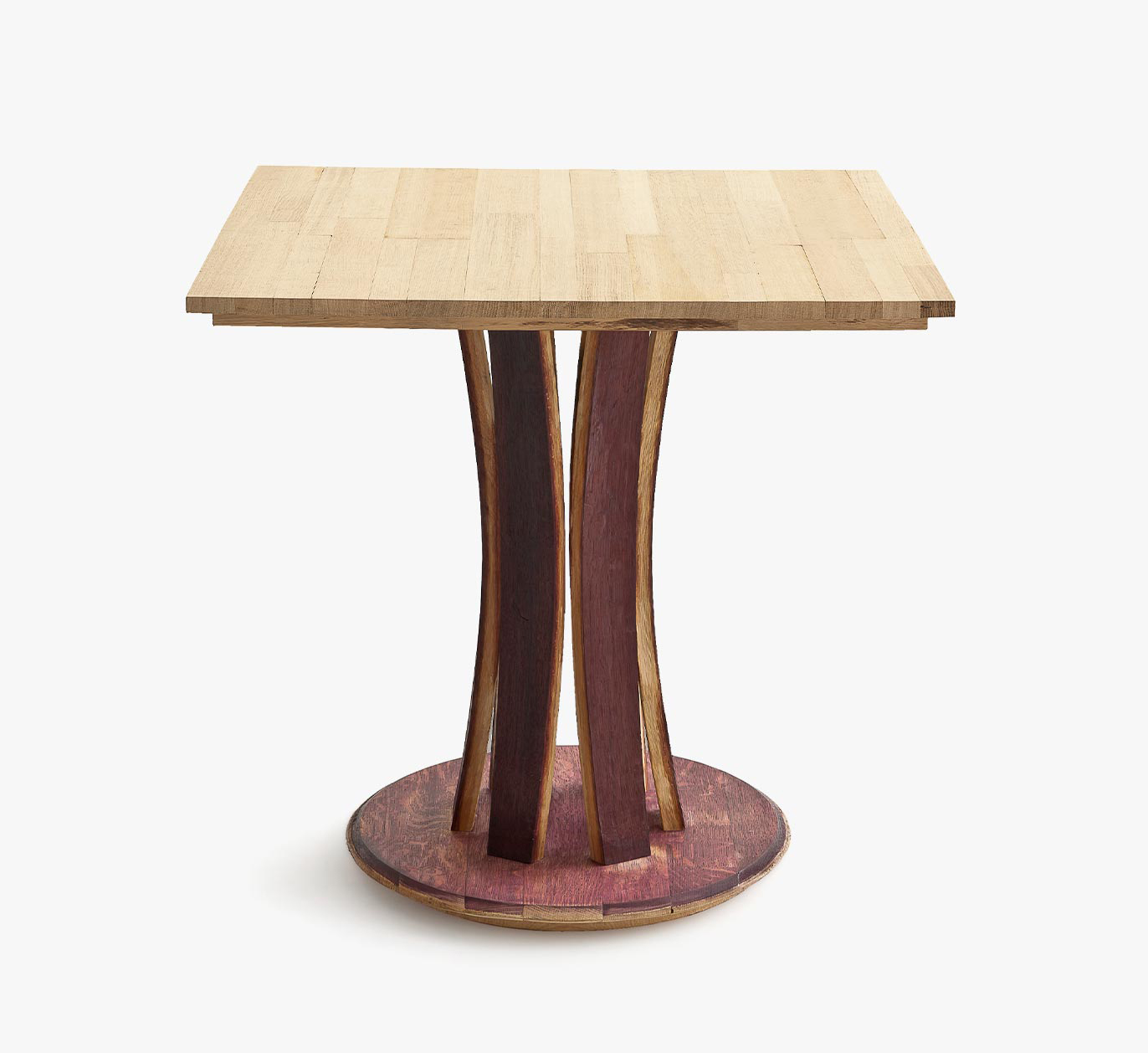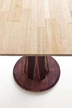 table avec plateau composé par lattes collées désalignées, pied central composé par douves curvilignes se rétrécissant au centre et base au sol réalisée à partir du couvercle des barrique