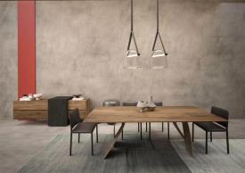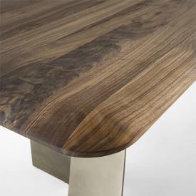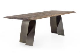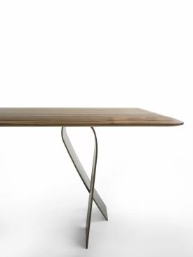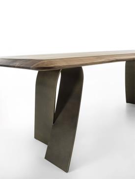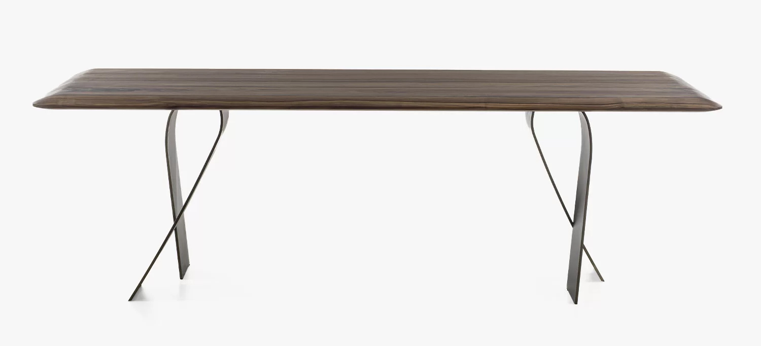 table avec un plateau en bois massif à lattes collées, caractérisé par des épaisseurs amincies par le travail du savon pour donner légèreté et sinuosité, associé à des pieds en acier qui s'enroulent sur eux-mêmes pour évoquer la flexibilité d'un ruban.