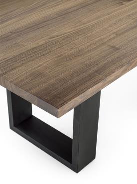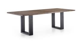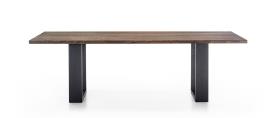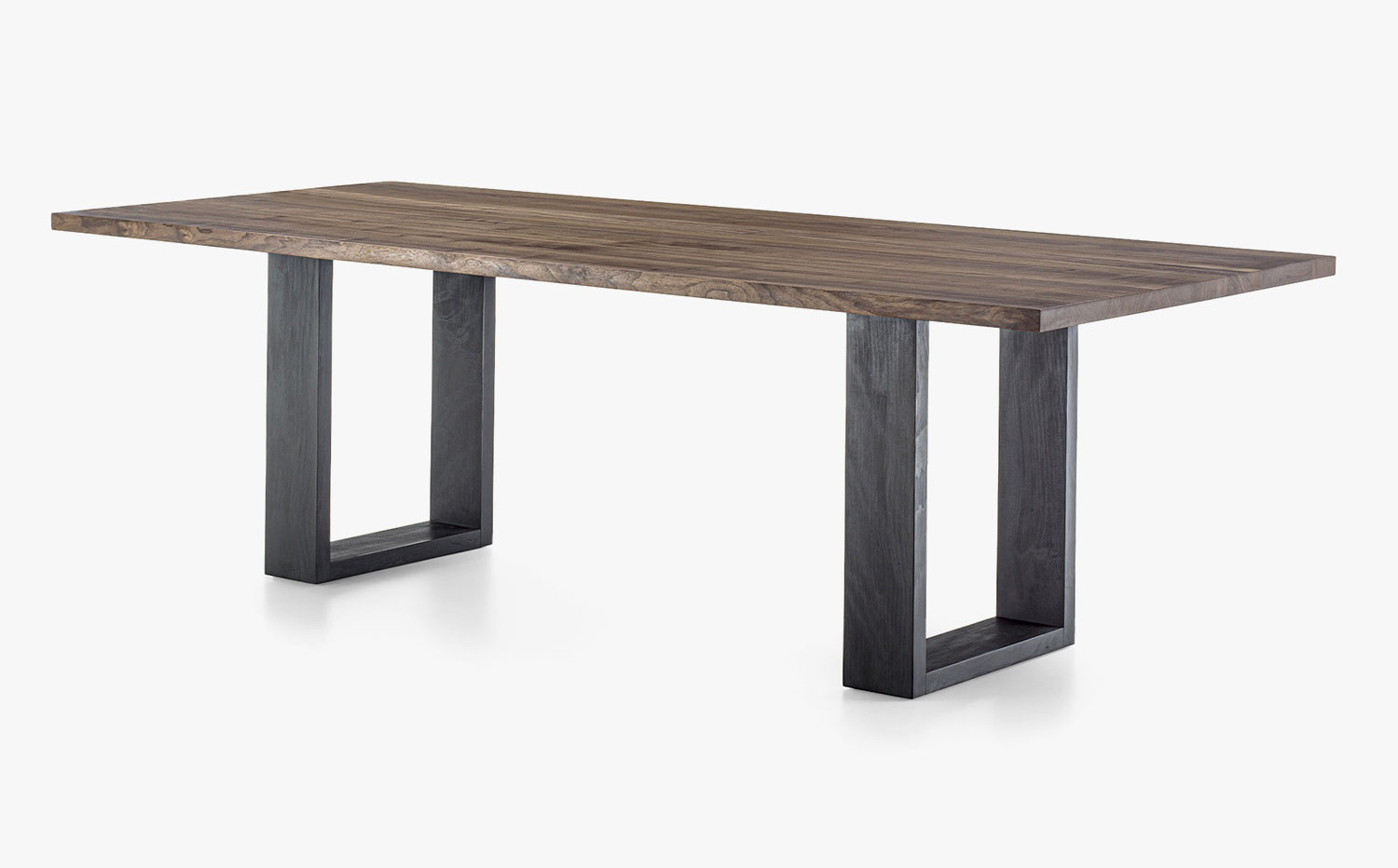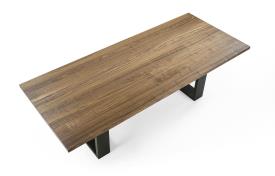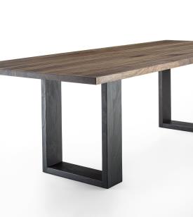 table avec plateau en bois massif composé de lattes collées aux bords droits, associée à des pieds en bois massif en forme de U, pour un effet visuel plus dynamique.