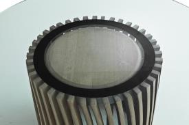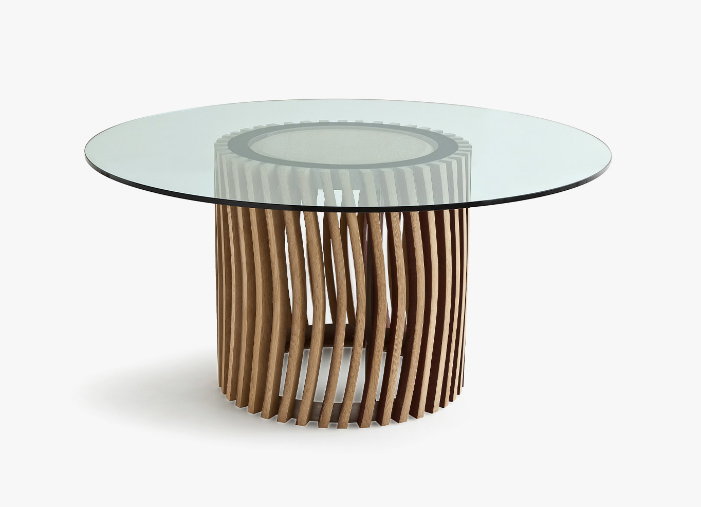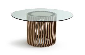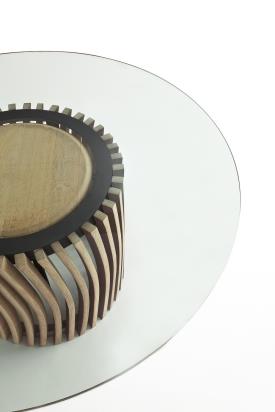 table ronde avec plateau en verre extra clair de 1,5 cm d’épaisseur, caractérisée par un pied central en lattes de bois de chêne provenant des barriques, disposées en profilé et fixées à une structure métallique.