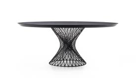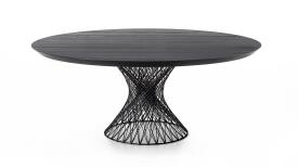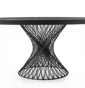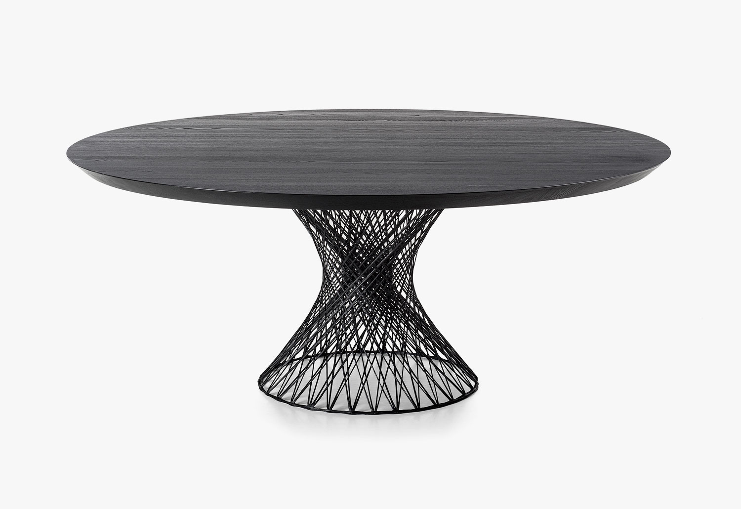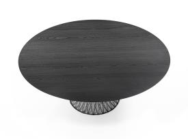 table avec plateau rond en bois massif à lattes collées, soutenu par une base en fibre de carbone tressée. Malgré la légèreté du matériau, la structure de la base garantit une grande résistance, supportant le poids du plateau en bois massif.