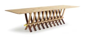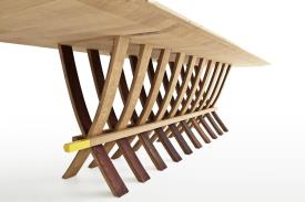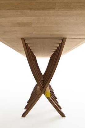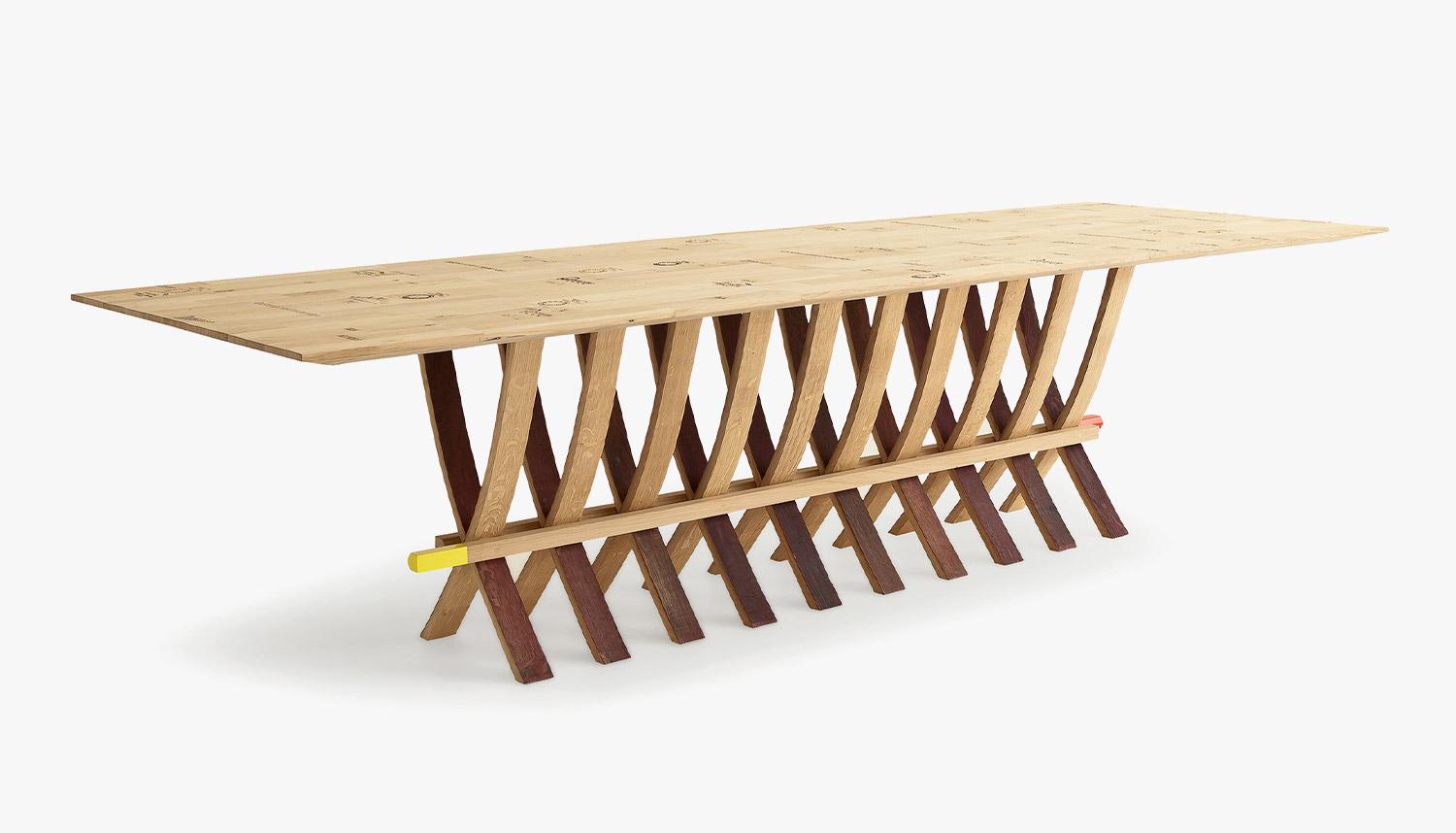 table avec plateau en lattes collées de chêne et bords amincies. Des douves de barrique caractérisent la forme du socle, rappelant les magnifiques bateaux anciens.