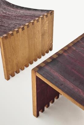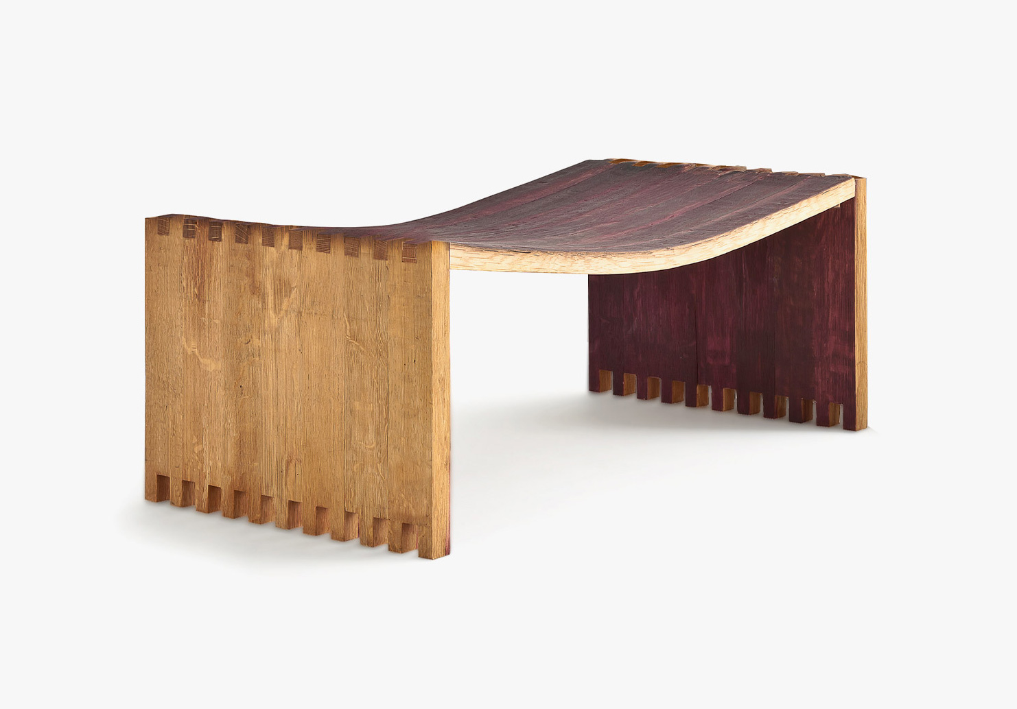 Banc réalisé entièrement en chêne de barriques. L’assise est fabriquée à partir de douves collées, dont la partie incurvée détermine le confort. Les éléments verticaux sont caractérisés par des queues d'aronde.