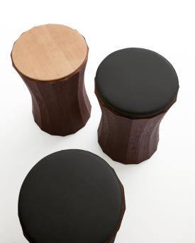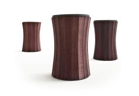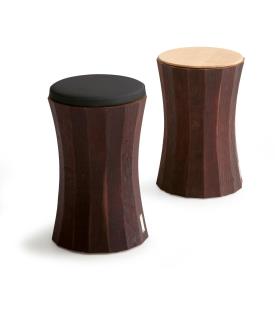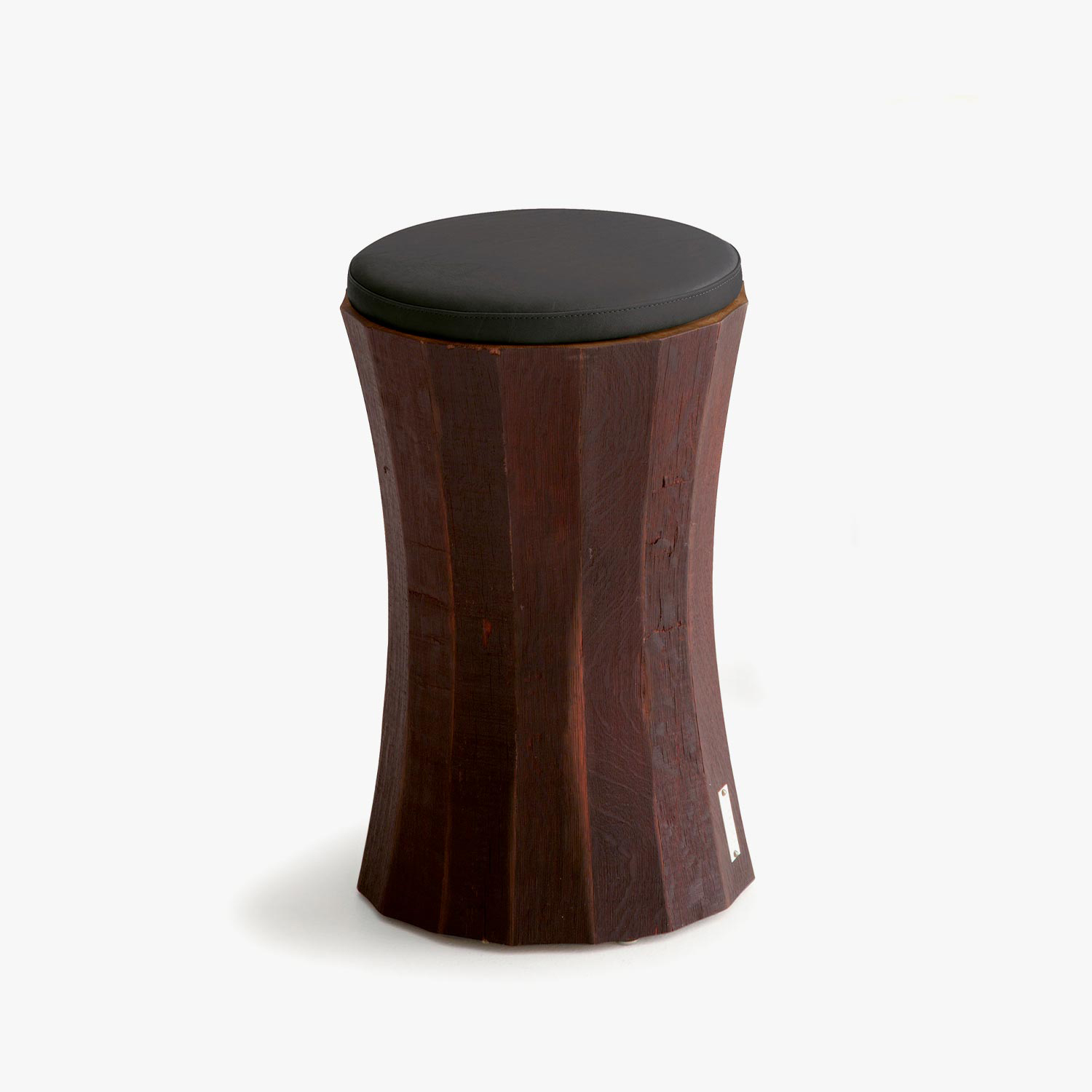 Tabouret caractérisé par la disposition radiale des douves, qui proviennent de barriques, et par la couleur bordeaux. Assise en bois ou rembourrée et recouverte de cuir.
