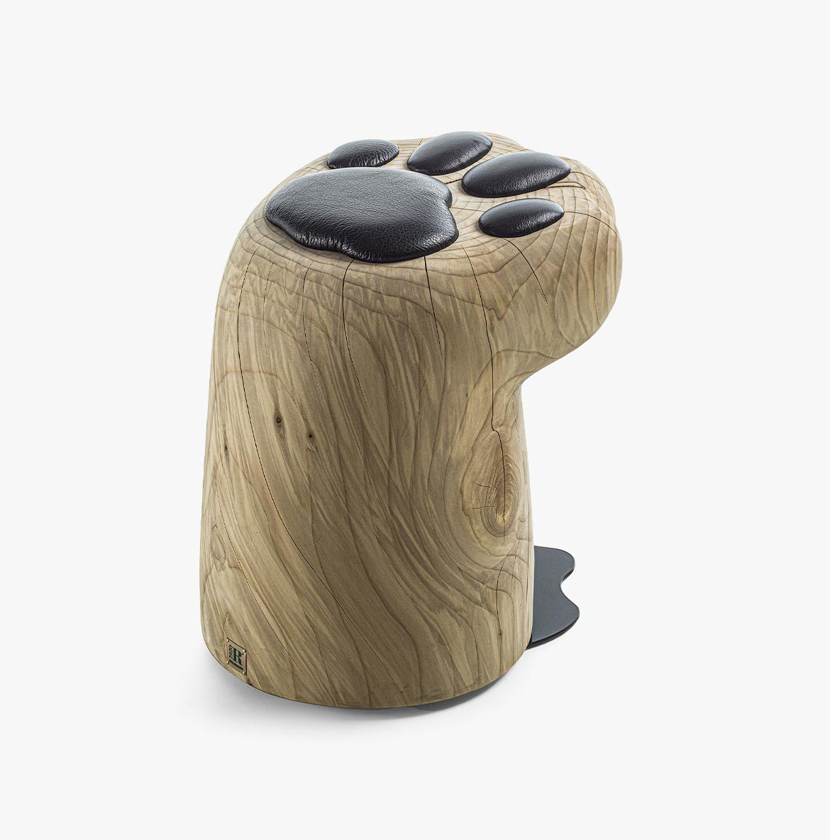 Tabouret élégant en bois massif de cèdre odoriférant, fabriqué à partir d’un seul bloc de bois de réutilisation. Son design, inspiré de la patte d’un chat, évoque des formes douces et naturelles. L’assise est agrémentée de coussins rembourrés en tissu ou en cuir, façonnés pour reproduire les coussinets félins.