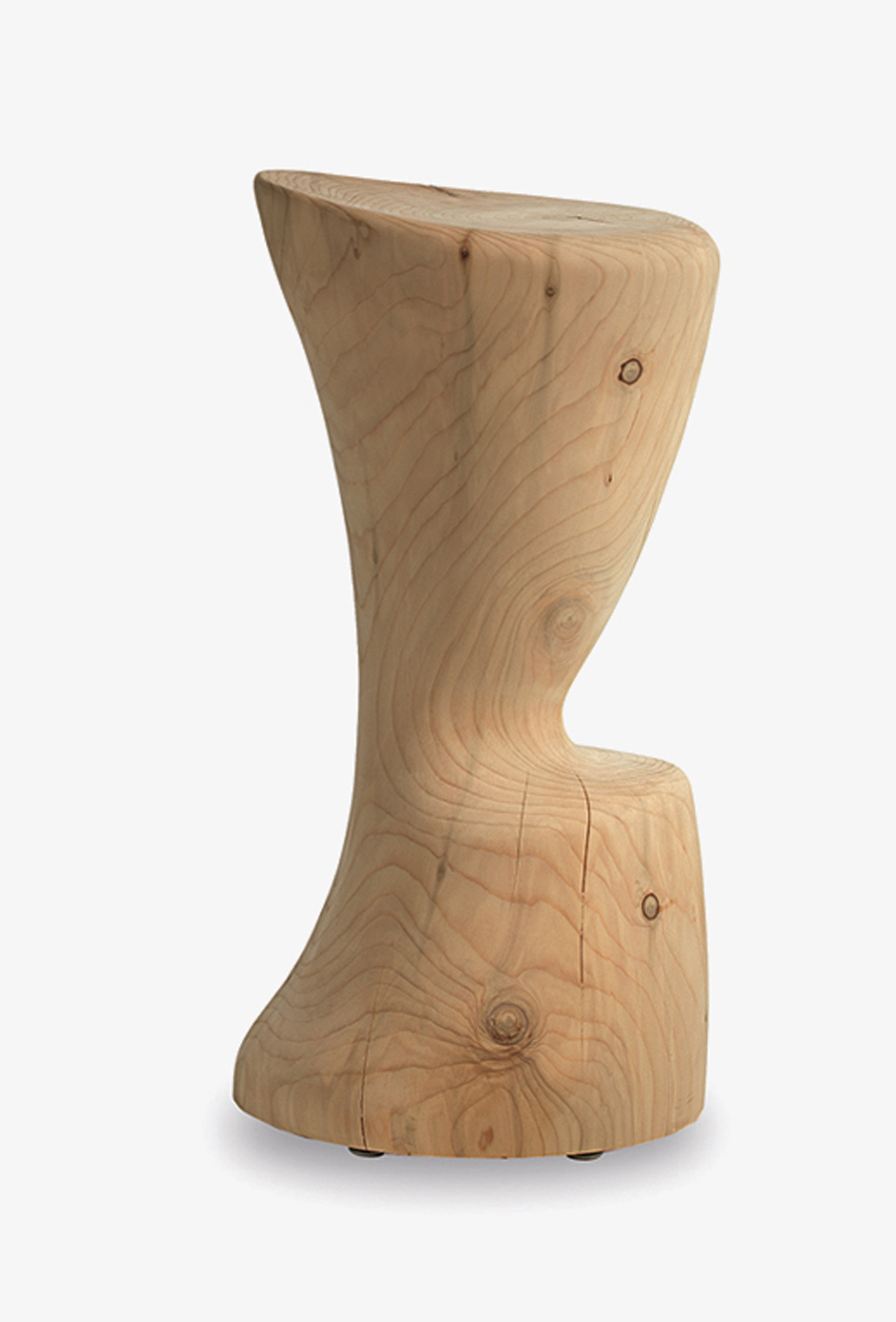 tabouret haut fabriqué à partir d'un seul bloc de cèdre massif odoriférant, conçu pour servir de siège à un comptoir de bar ou à une table haute et pourvu d’un repose-pieds sculpté dans le bois.