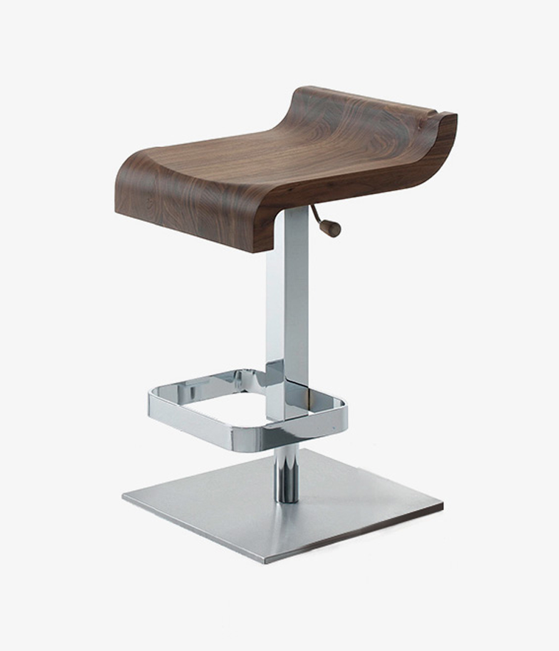 Tabouret caractérisé par une assise en bois massif, disponible en différentes formes. Piétement avec colonne pivotante en acier satiné, réglable en hauteur grâce au système télescopique à gaz.