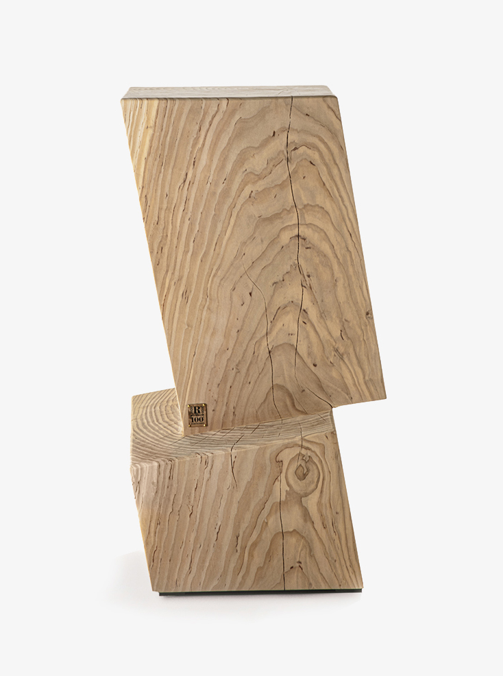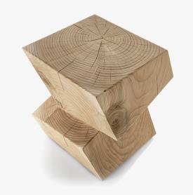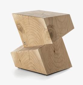 Tabouret fabriqué à partir d'un seul bloc de cèdre massif odoriférant dont la forme veut être un hommage aux maisons cubiques de l’architecte hollandais Piet Blom. Dans la variante haute la partie inférieure peut être utilisée comme repose-pieds.
