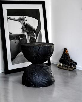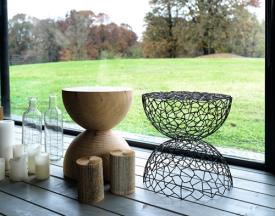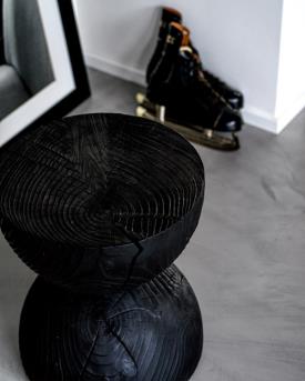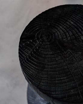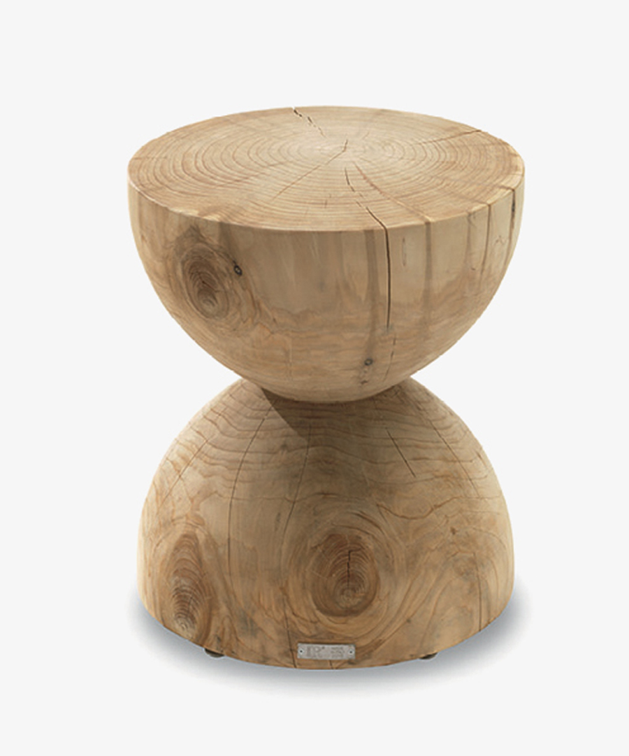 Tabouret en cèdre massif parfumé, travaillé à partir d'un seul bloc, qui se caractérise par deux hémisphères superposés l'un sur l'autre pour former un sablier.