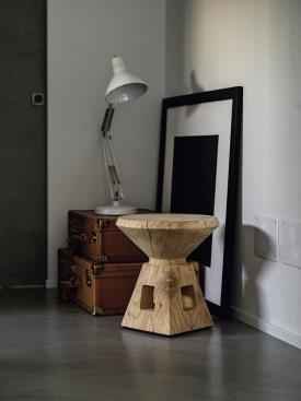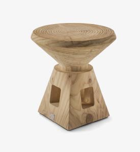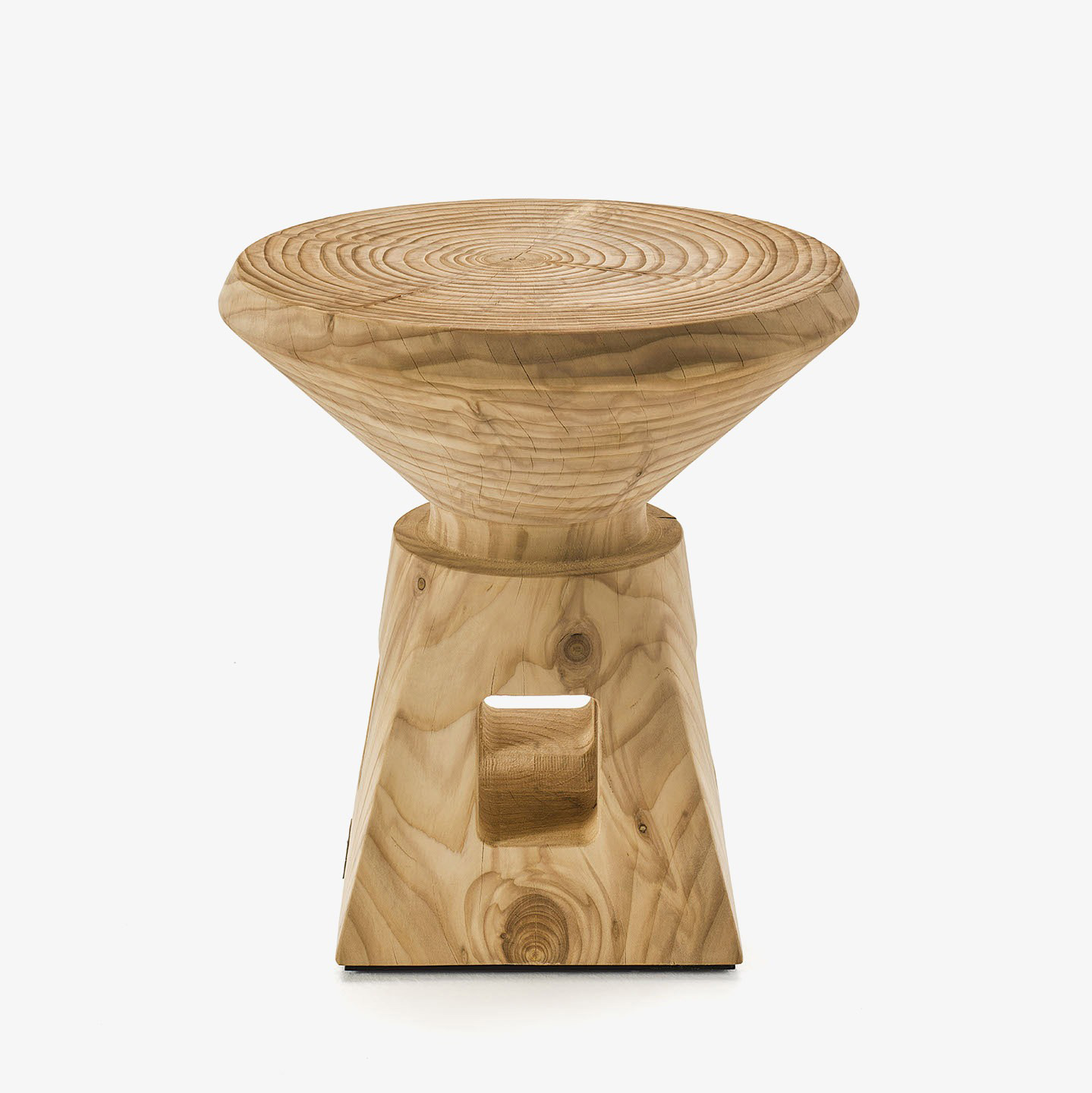 Riva 1920 Design. Mario Cucinella, 2018 Dimensions : Ø 43,5 x h 45 cm Tabouret fabriqué à partir d'un seul bloc de cèdre massif odoriférant, inspiré par les formes caractéristiques des vases étrusques. tabouret extérieur outdoor